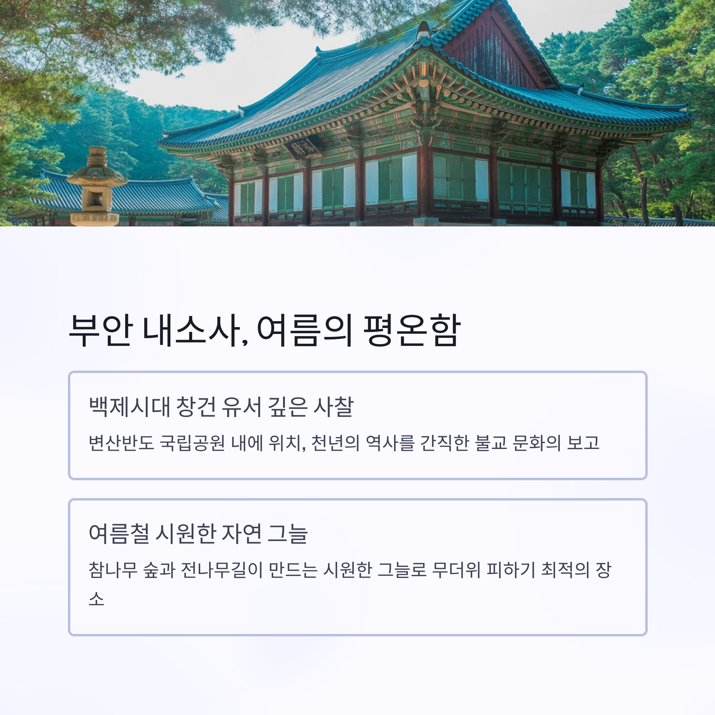 전통의 도시 전주와 천혜의 자연을 품은 부안, 여름철 두 지역을 잇는 사찰 여행 코스는 조용한 힐링과 함께 깊은 역사적 감동을 줍니다. 이번 글에서는 전주의 대표 명사찰부터 부안 내소사까지 연결되는 여름철 사찰 여행 코스를 소개합니다. 아름다운 풍경과 함께 고요한 명상의 시간을 가질 수 있는 특별한 여정을 계획하고 계시다면, 이 코스가 제격입니다.