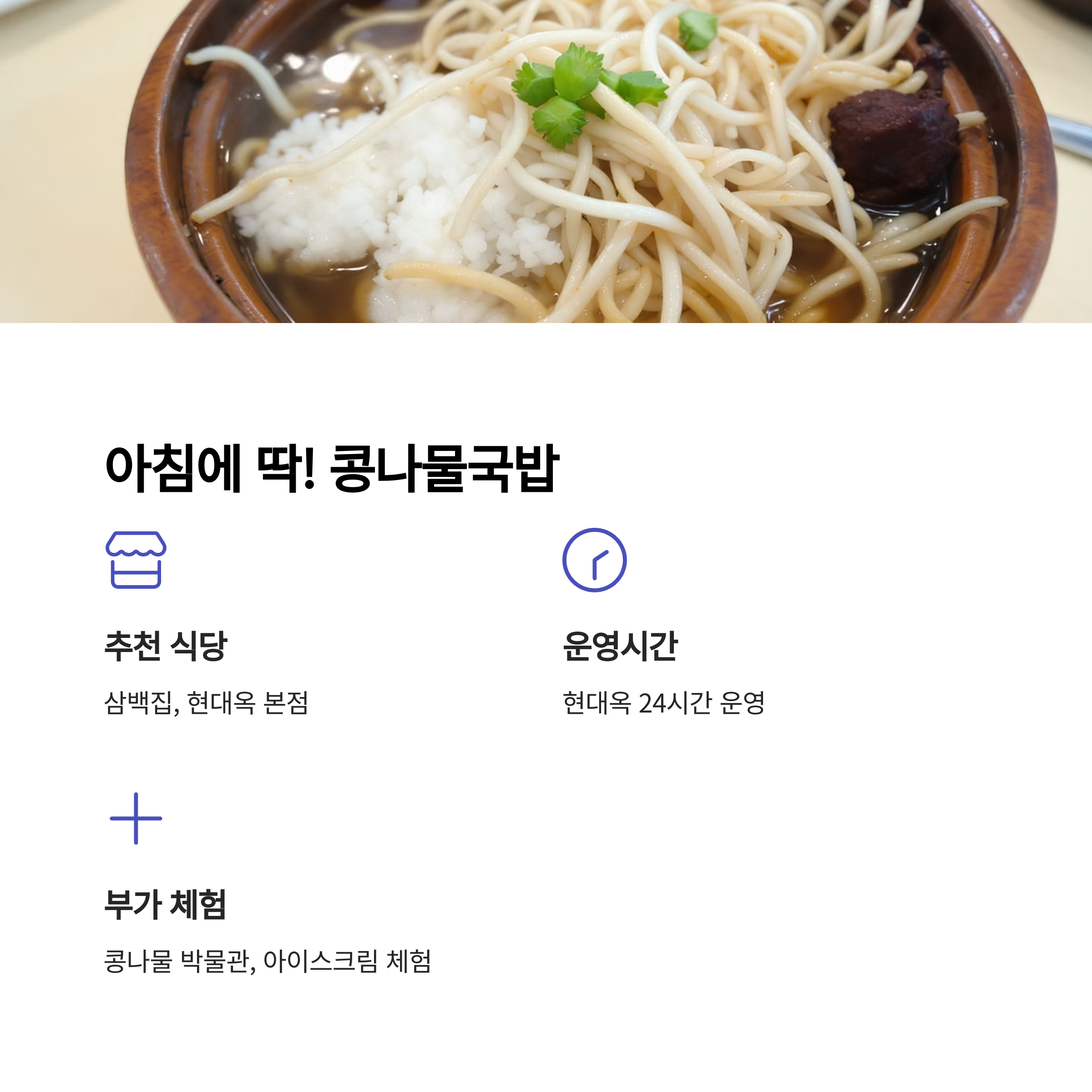| 오전 | 콩나물국밥 식사 (삼백집 또는 현대옥) |