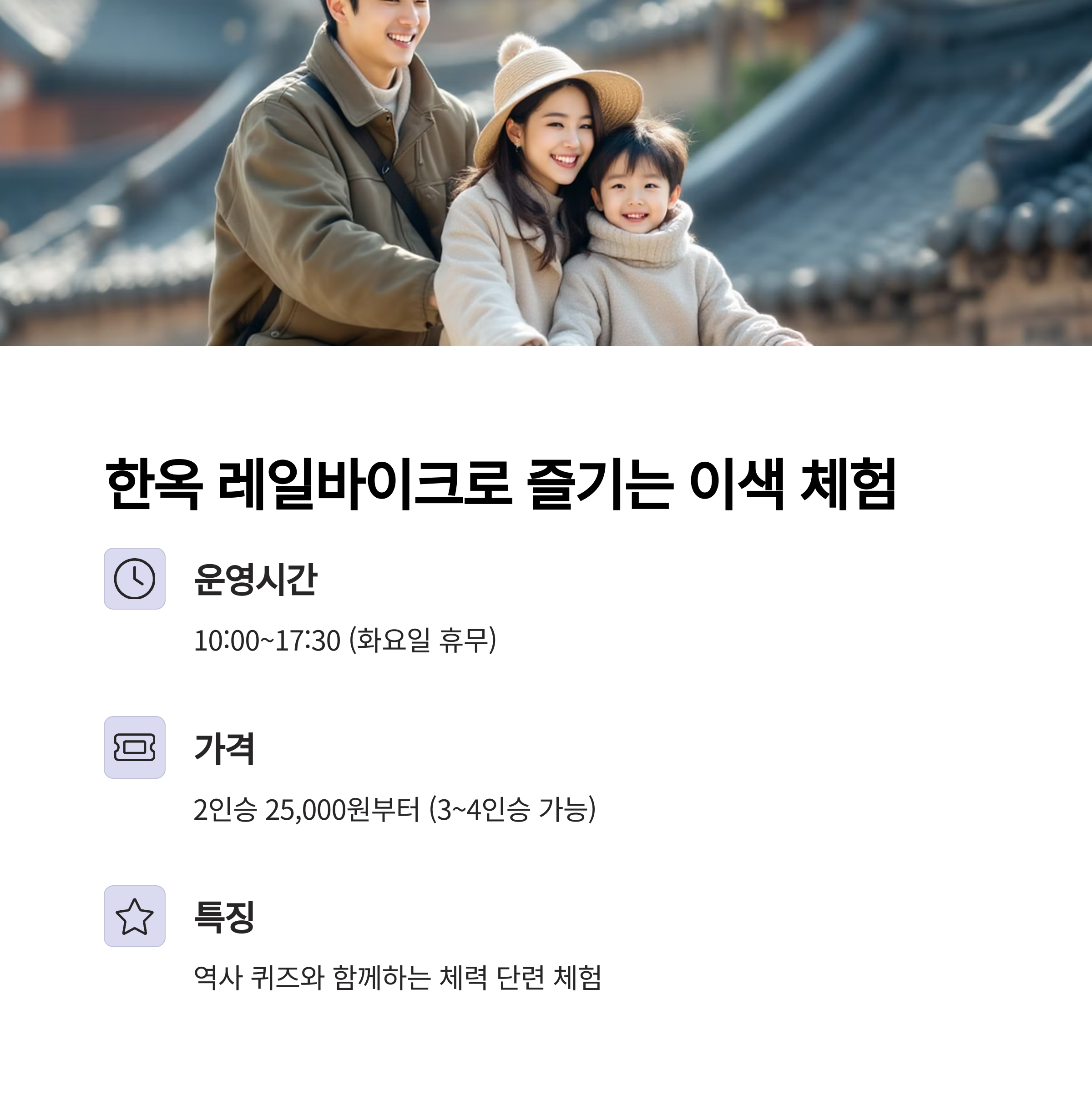 전통 기와지붕 풍경을 바라보며 가족이 함께 달릴 수 있는 이색 체험입니다.