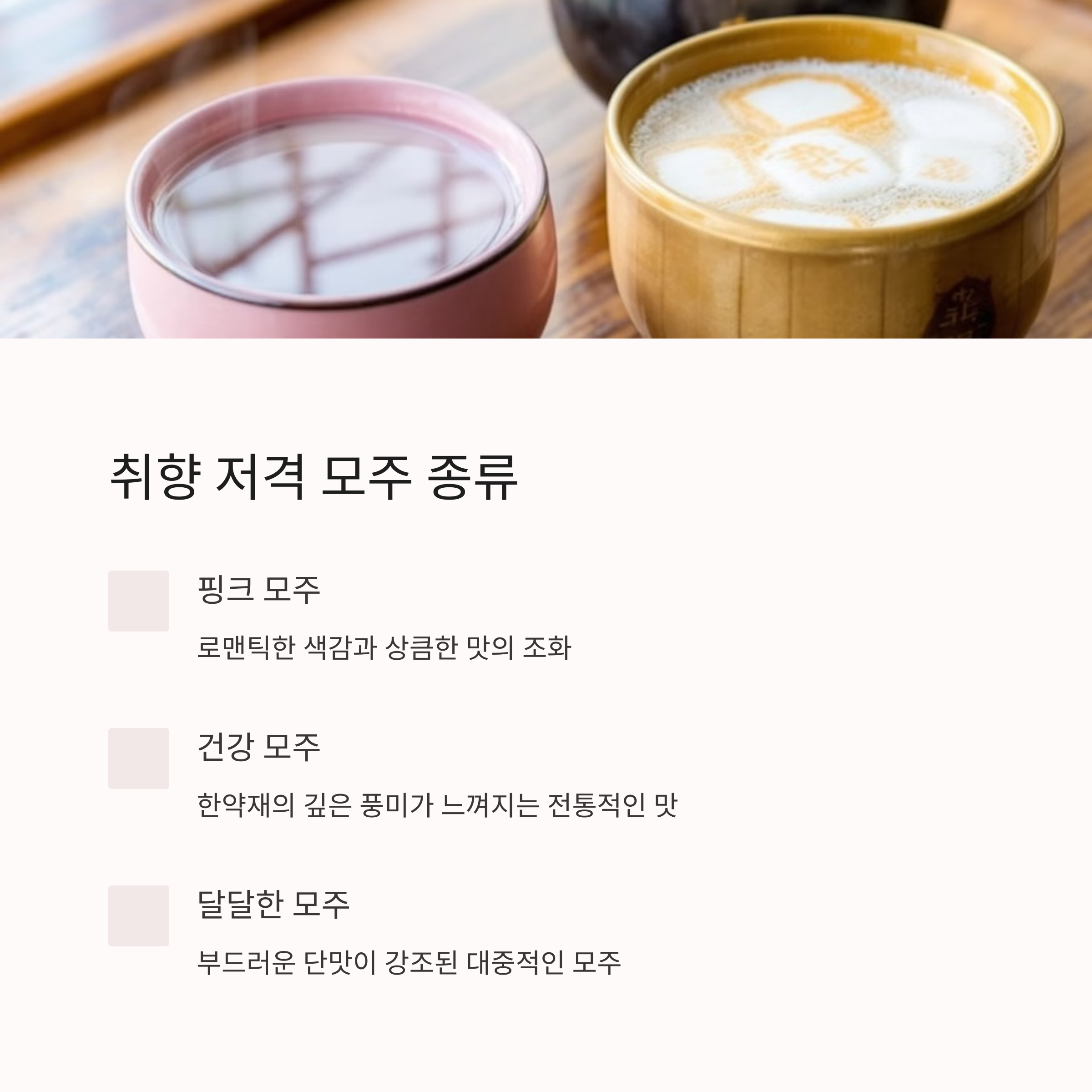 | 직접 끓여 만드는 핑크/건강/달달 모주 | 전통과 감성을 모두 담은 원데이 클래스 | 사전 예약 필수, 1인 28,000원 |