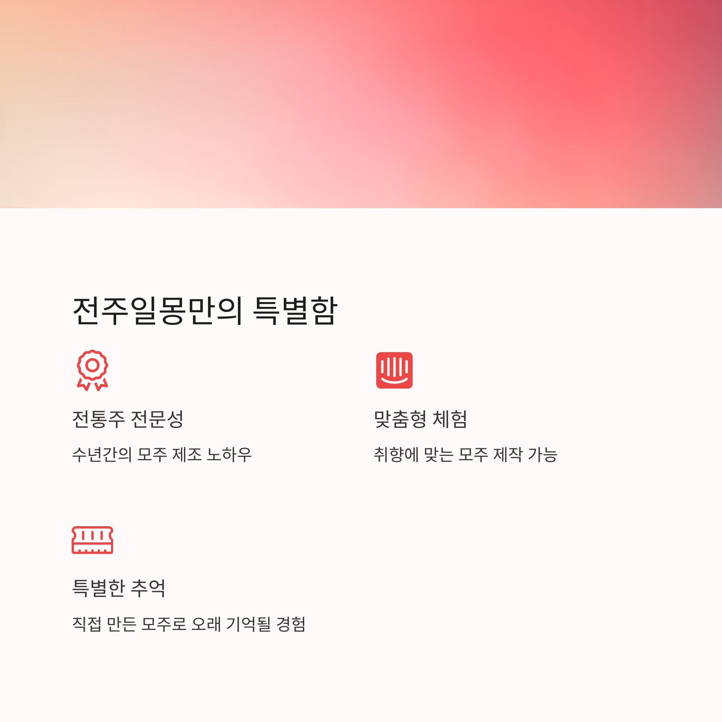 전주일몽의 체험 클래스는 약 75분간 진행되며, 핑크 모주, 건강 모주, 달달한 모주 중 하나를 골라 각자의 취향에 맞는 맛과 향을 직접 만들어볼 수 있습니다. 체험이 끝나면 자신이 만든 모주를 병에 담아 가져갈 수 있고, 다과와 함께 여유로운 시음 시간도 포함되어 있어 풍성한 전통 체험을 즐기실 수 있습니다.