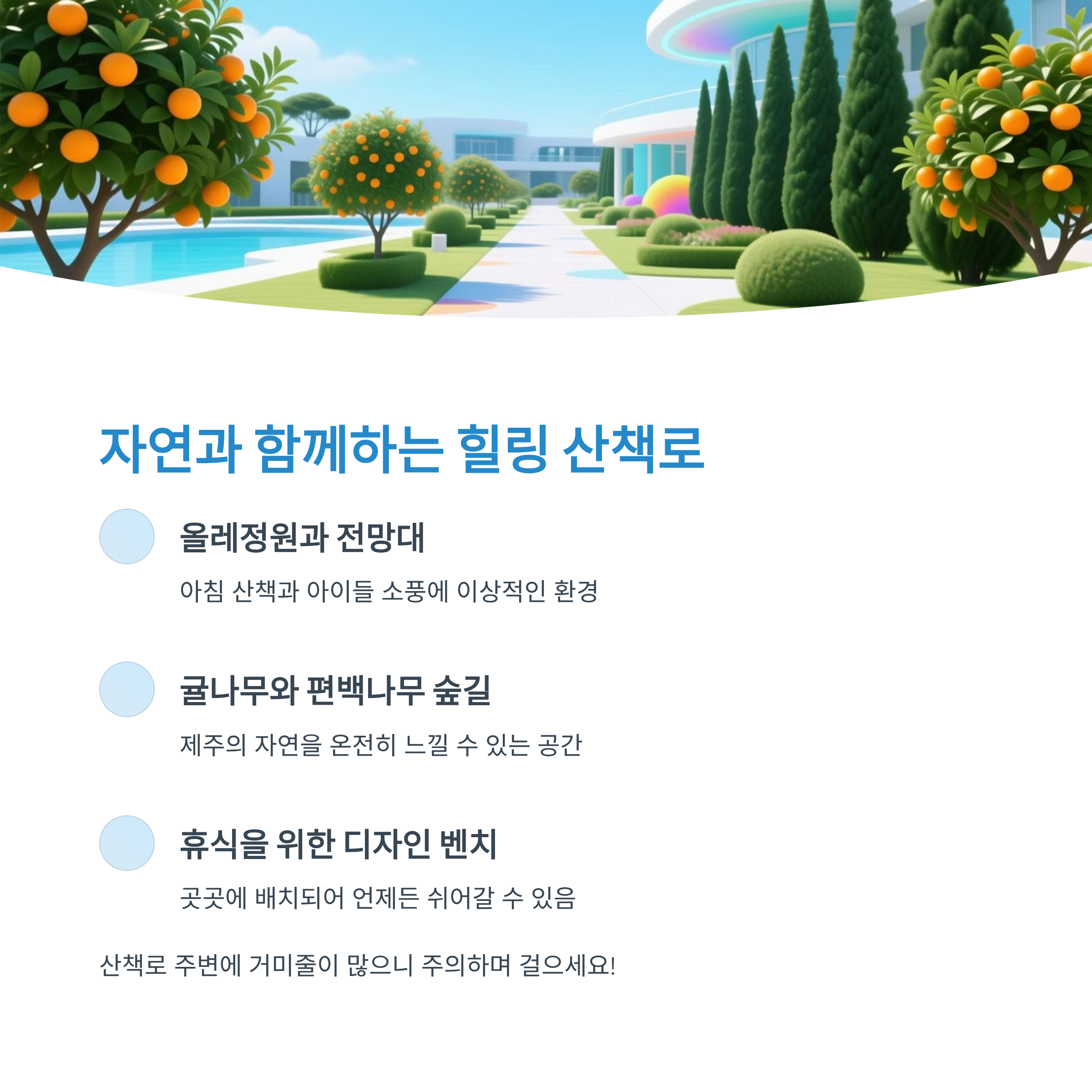 귤나무 정원, 편백나무 숲길, 귀여운 디자인 벤치 등