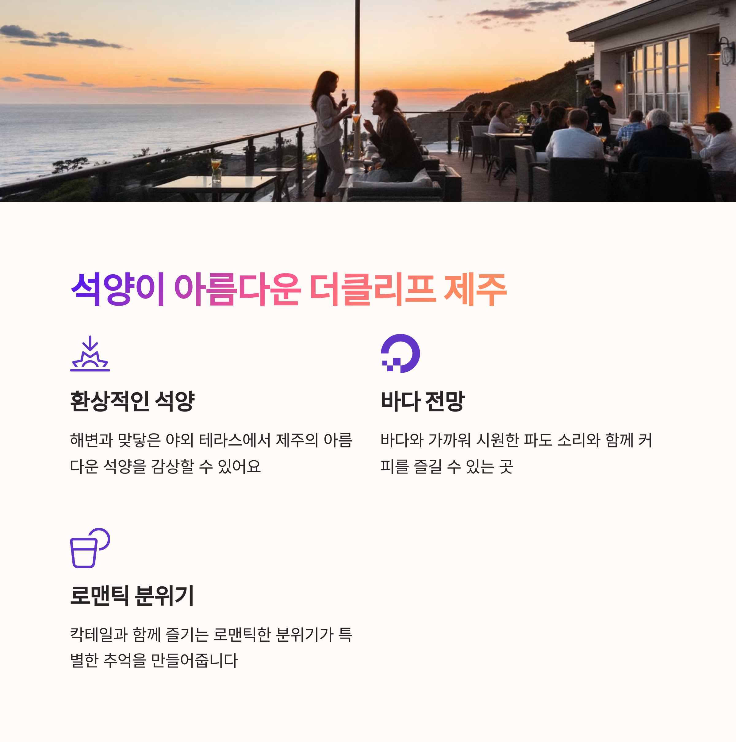 ‘더클리프 제주’는 석양을 감상하기 좋은 곳으로, 야외 테라스에서 시원한 제주 바다를 바라보며 여유로운 시간을 보낼 수 있습니다. 해 질 무렵 분위기 있는 조명이 더해지면서 더욱 로맨틱한 감성을 선사합니다.