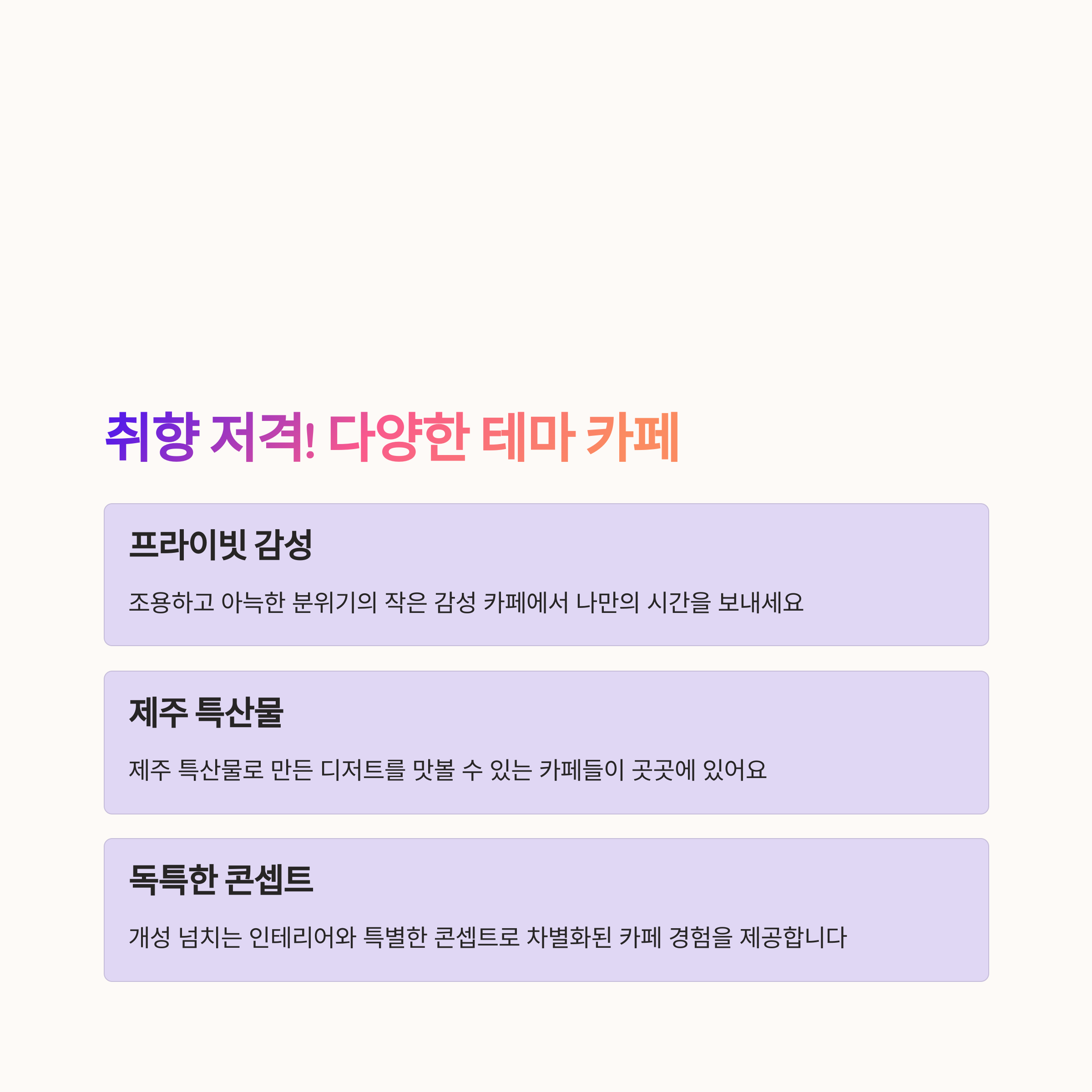 이외에도 애월에는 다양한 분위기의 카페들이 많습니다. 제주 특산물로 만든 음료와 베이커리를 판매하는 카페들도 있으며, 조용하고 프라이빗한 분위기를 원하는 분들에게는 숨겨진 작은 감성 카페들도 추천합니다. 각 카페마다 특색이 다르니, 취향에 맞는 곳을 찾아보세요!