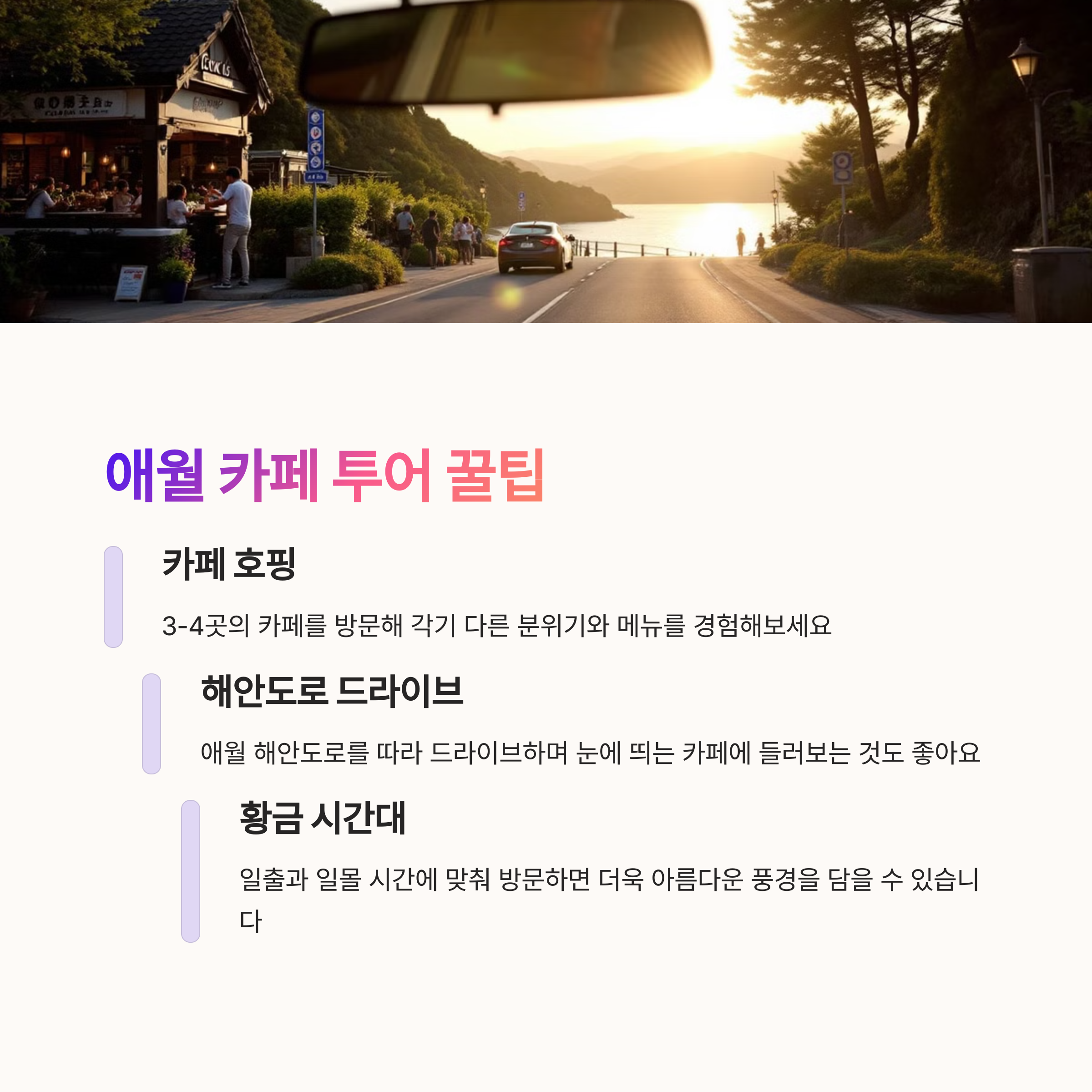제주 애월 카페거리는 아름다운 바다 전망과 감성적인 분위기가 어우러진 최고의 힐링 공간입니다. 여러분도 제주에서 여유롭게 커피 한 잔하며 멋진 시간을 보내보세요!