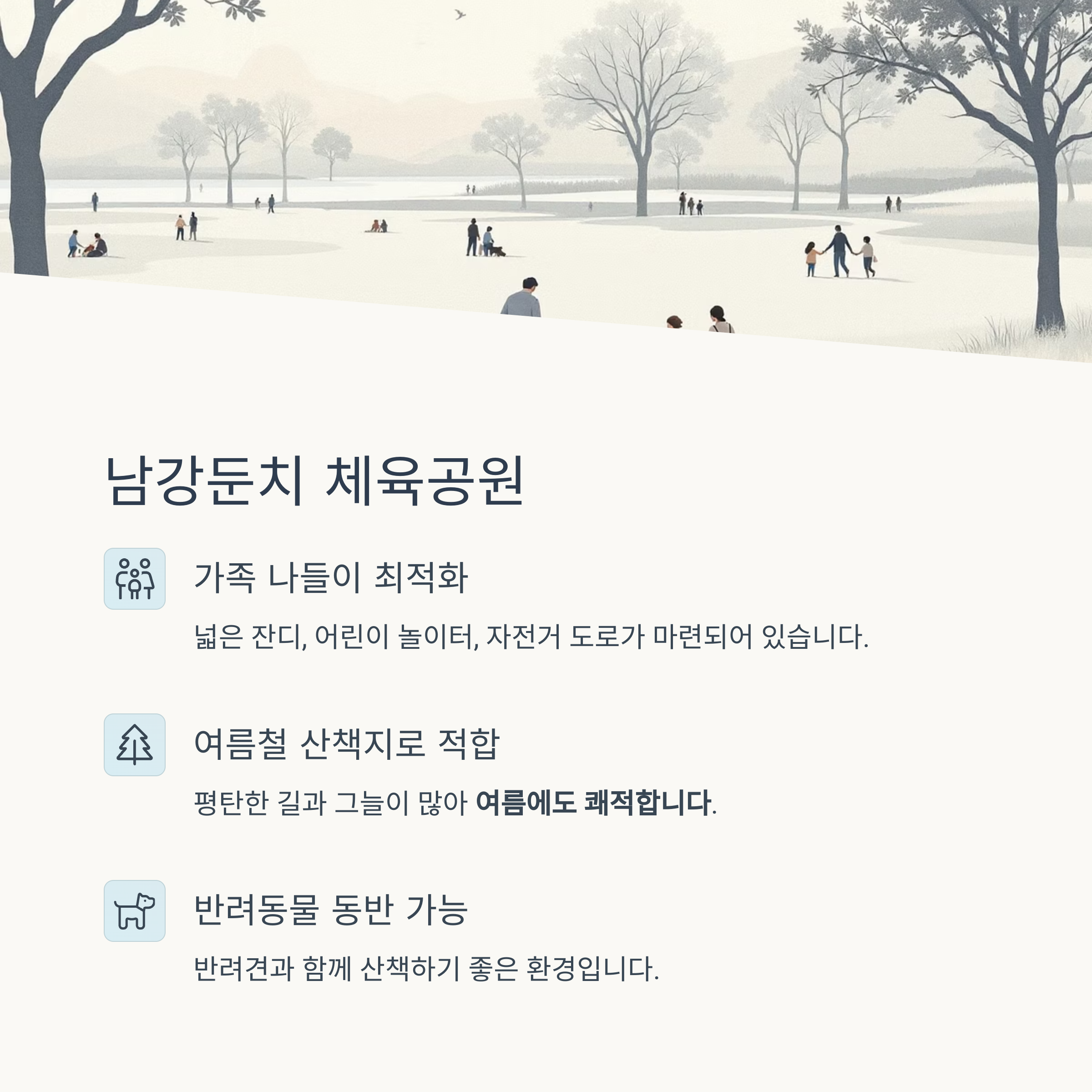| 남강둔치 체육공원 | 가족 중심, 반려동물 가능 | 낮~저녁 |