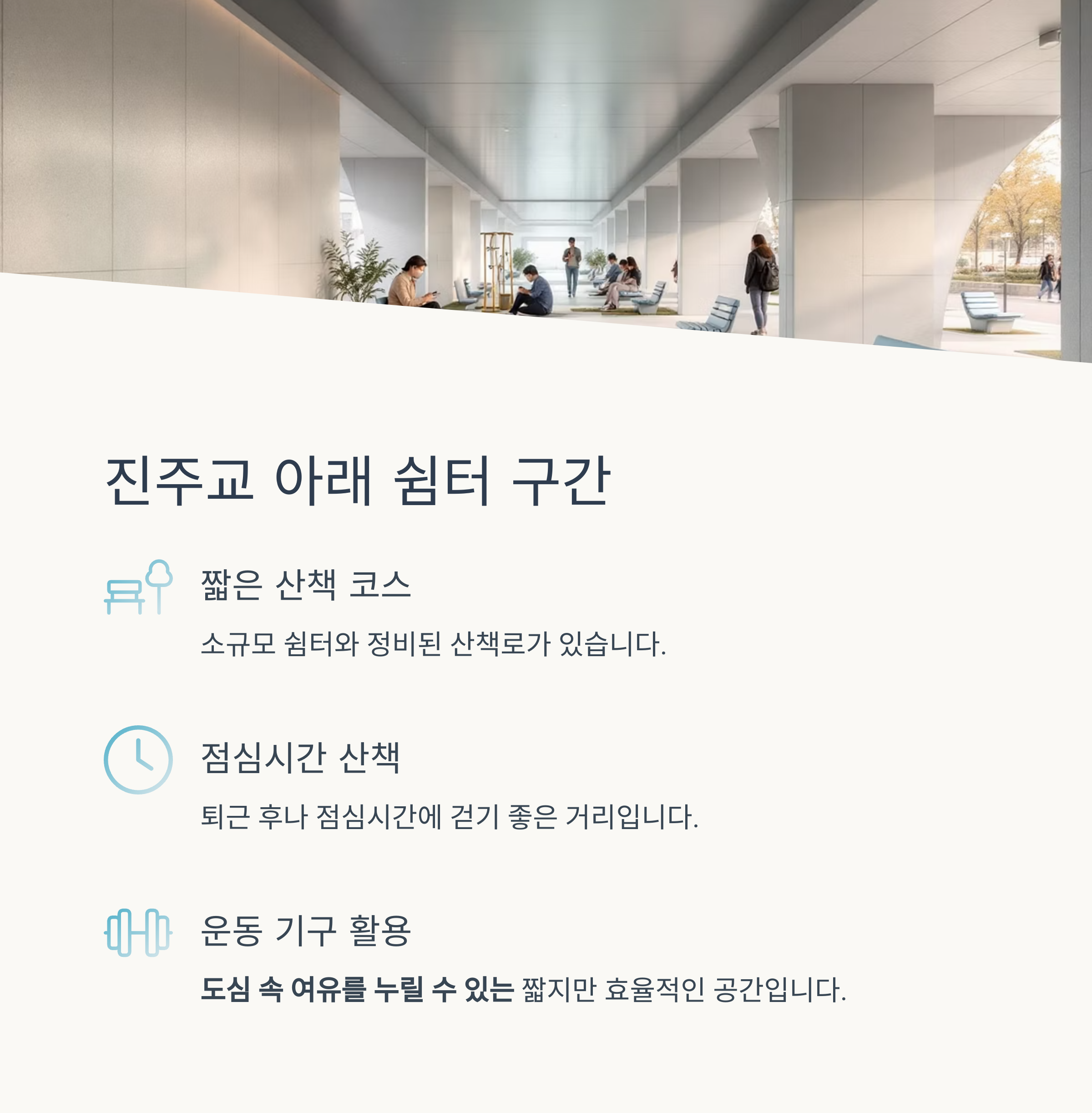 | 진주교 아래 쉼터 | 짧은 산책+운동기구 활용 가능 | 점심/퇴근 후 |