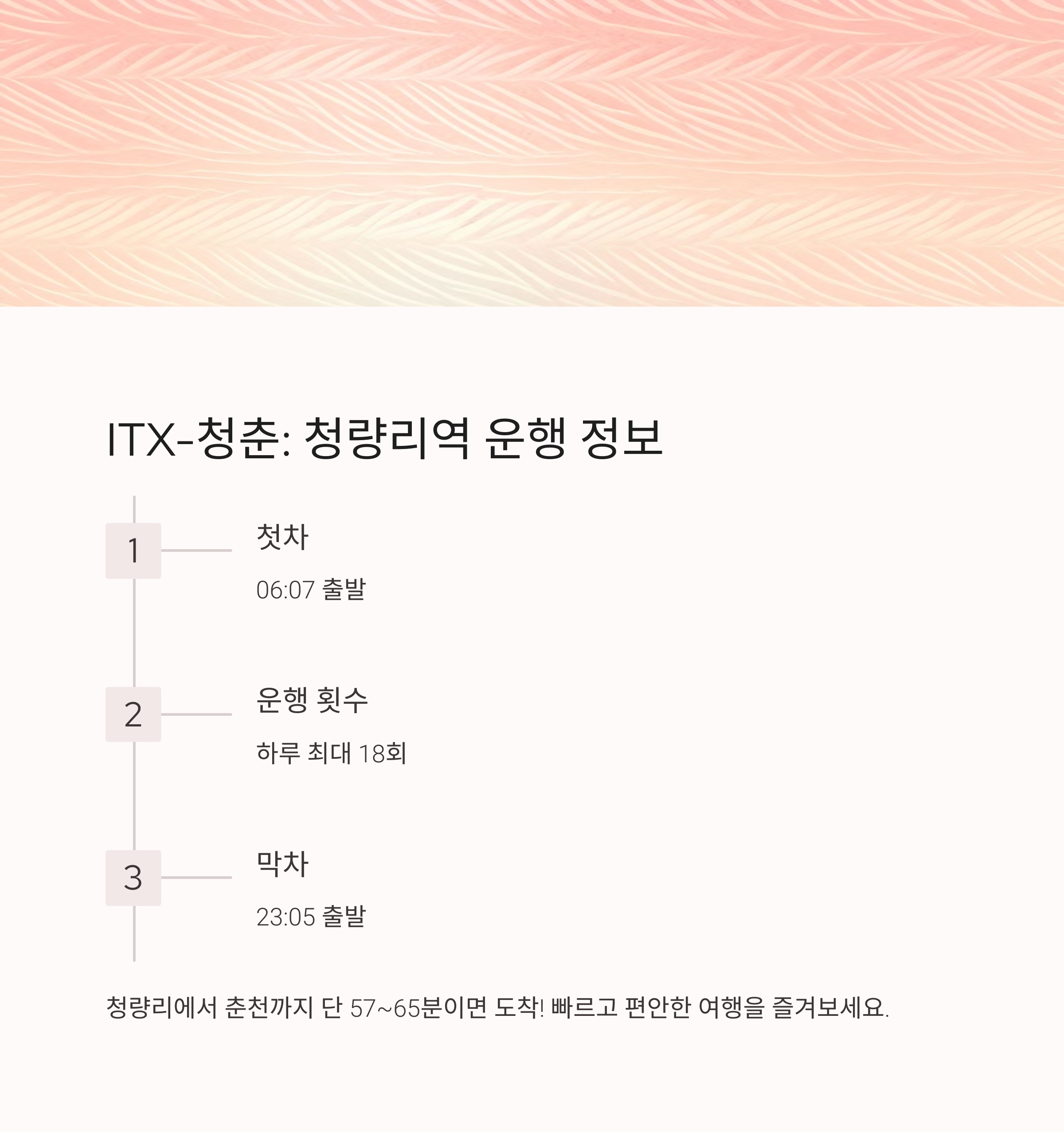 | ITX-청춘 시간표 | 하루 14~18회 운행, 첫차 06:07, 막차 23:05 |