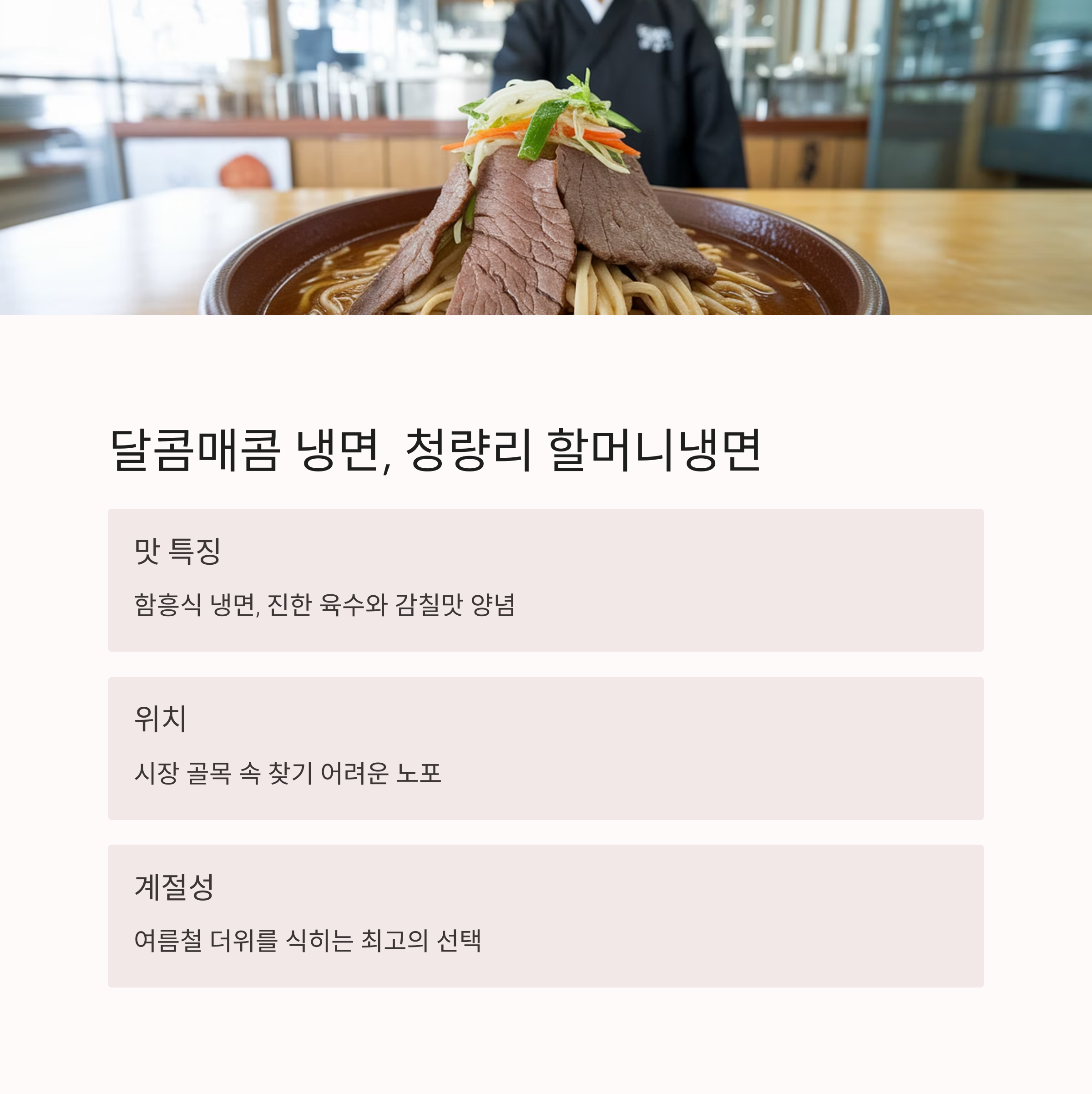 이 외에도 청량리역 인근에는 ‘청량리 할머니냉면’, ‘배꼽집’, ‘혜성칼국수’, ‘부추소곱창’ 등 고유의 개성과 깊은 맛을 자랑하는 식당들이 많이 있습니다. 매운 냉면으로 입맛을 자극하고 싶은 분들에겐 ‘할머니냉면’을 추천드리며, 정갈한 평양냉면과 한우 요리를 함께 즐기고 싶은 분들께는 ‘배꼽집’이 제격입니다. 국물 맛이 일품인 ‘혜성칼국수’와 부추와 곱창의 환상적인 조합을 자랑하는 ‘부추소곱창’은 여행 전후로 만족감을 더해줍니다.