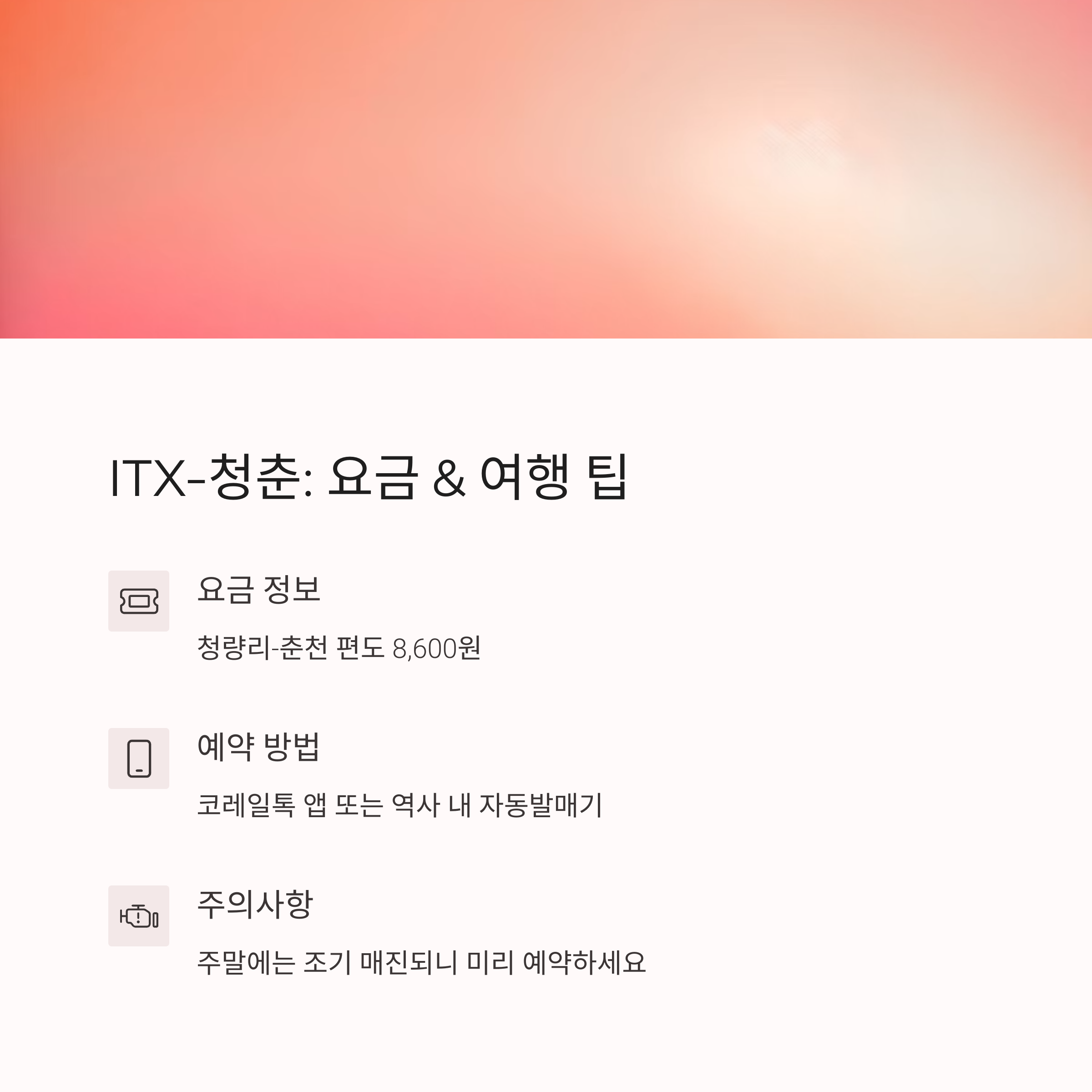 청량리역에서 출발하는 ITX-청춘 열차는 춘천뿐 아니라 다양한 강원도 여행의 시작점으로 제격입니다. 정해진 시간에 정확하게 출발하는 점과 비교적 짧은 소요시간, 합리적인 요금으로 인해 여행의 효율성을 크게 높일 수 있죠. 또한 여행의 묘미 중 하나는 바로 먹거리인데, 청량리역 인근의 다양한 맛집들은 이동 전후의 허기를 달래주기에 충분합니다. 따뜻한 국물요리부터 매콤한 냉면, 푸짐한 쌈밥과 고소한 곱창까지 선택의 폭이 넓어 누구와 함께여도 만족할 수 있습니다. 이번 주말, 청량리역에서 출발해 하루의 소소한 힐링을 누려보세요. ITX-청춘과 함께라면 여행은 더욱 편리하고, 맛집들과 함께라면 그 하루는 더욱 특별할 것입니다.