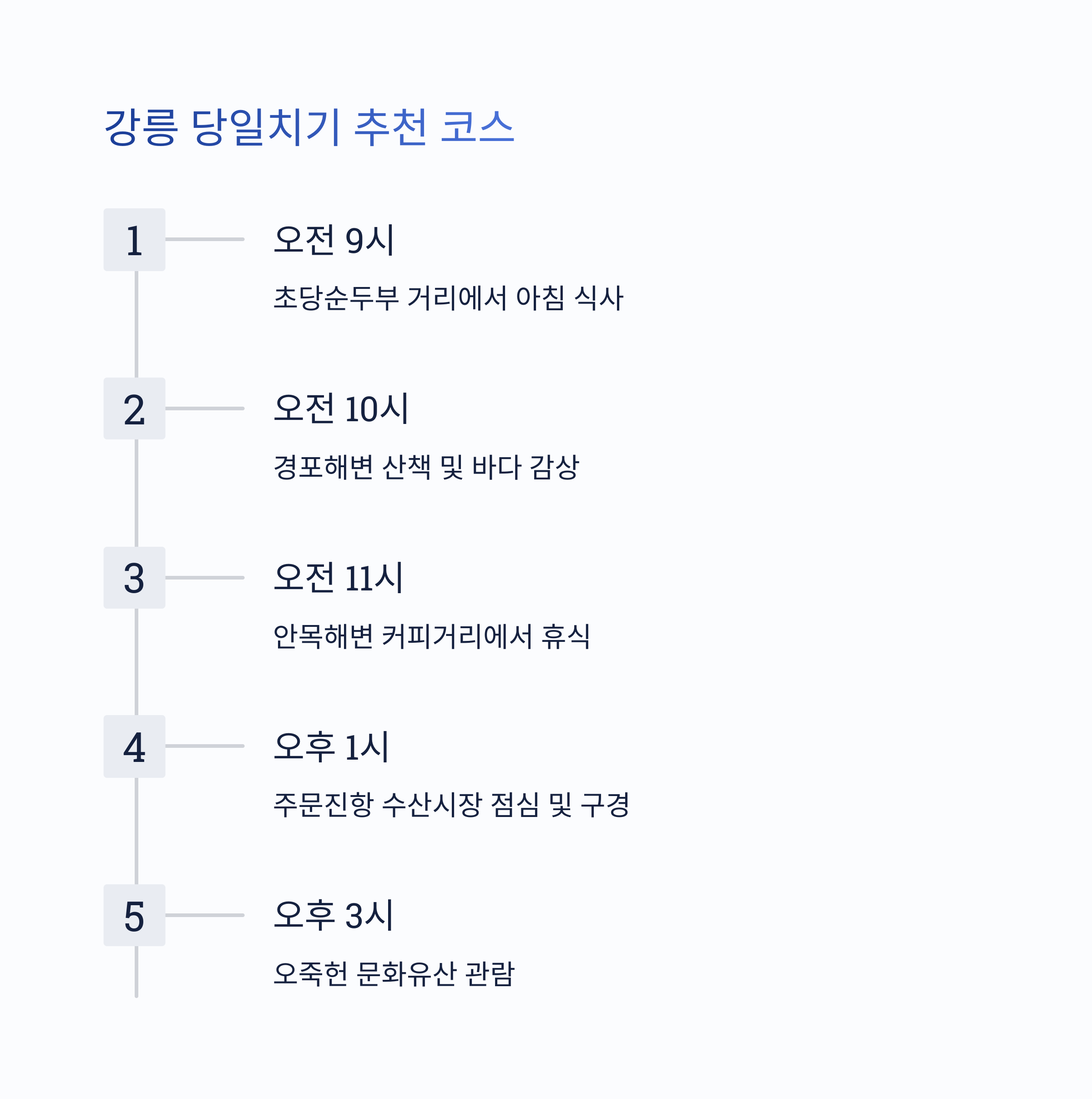 당일치기로 효율적으로 강릉을 둘러볼 수 있는 추천 동선은 다음과 같습니다.