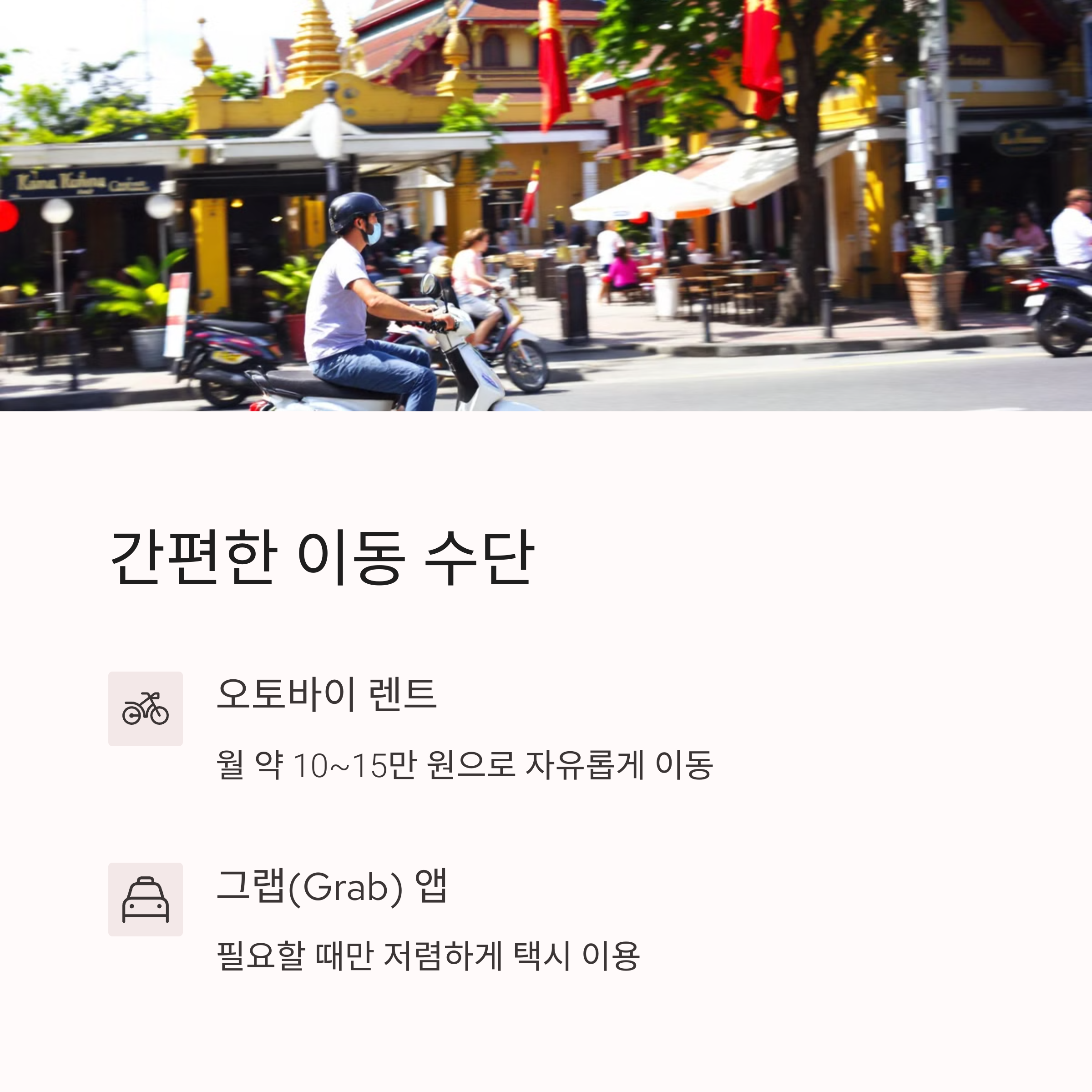 생활비도 저렴한 편입니다. 현지 식당에서 끼니를 해결하면 한 달에 20~30만 원 정도면 충분하며, 조금 더 고급 레스토랑을 이용하면 40~50만 원 정도가 듭니다. 교통비는 오토바이를 렌트하면 한 달에 약 10~15만 원, 그랩(Grab)을 이용하면 한 번에 2~5천 원 수준입니다.