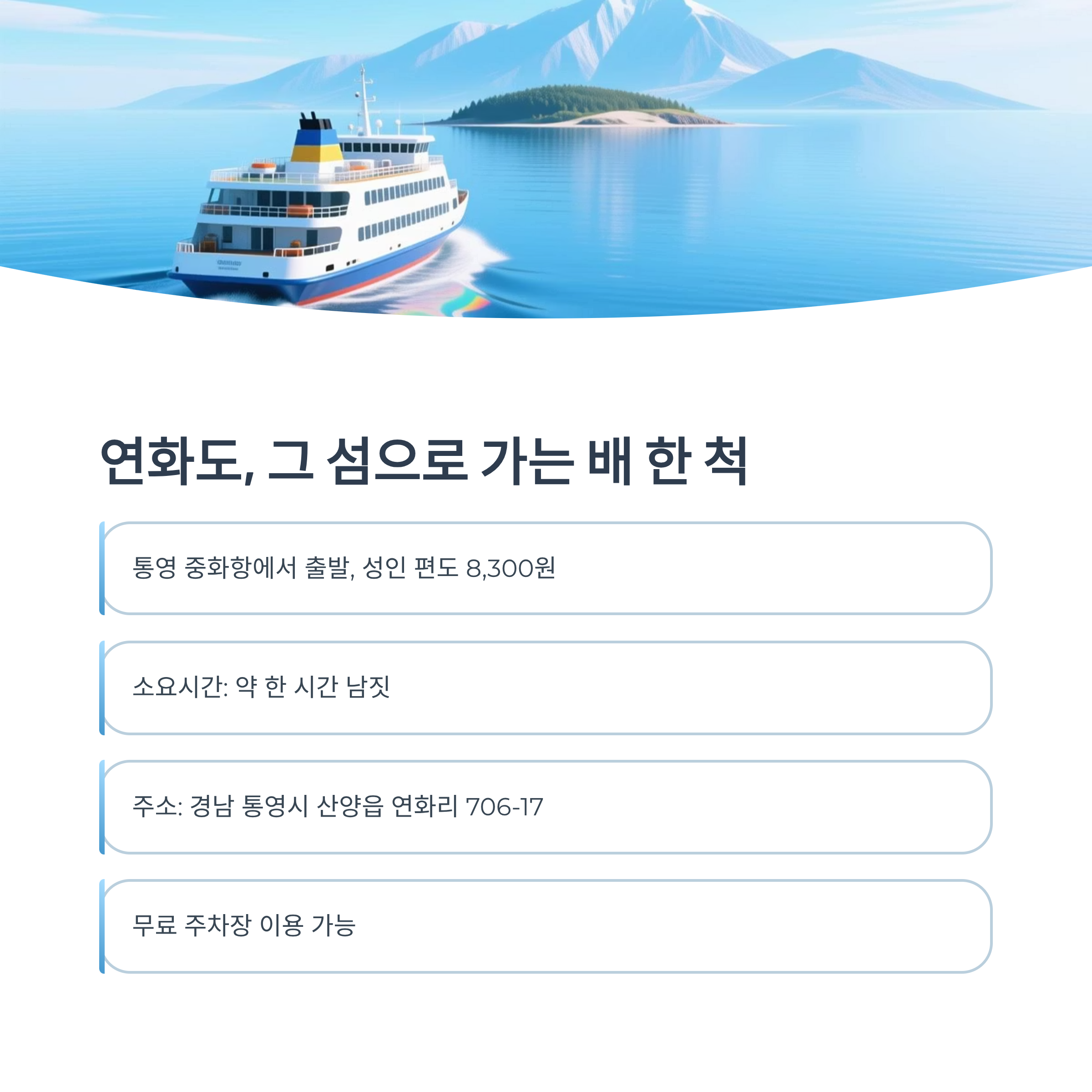 성인 기준 편도 8,300원으로, 연화도까지 약 한 시간 남짓 소요되며 기상 상황에 따라 지연될 수 있어요.