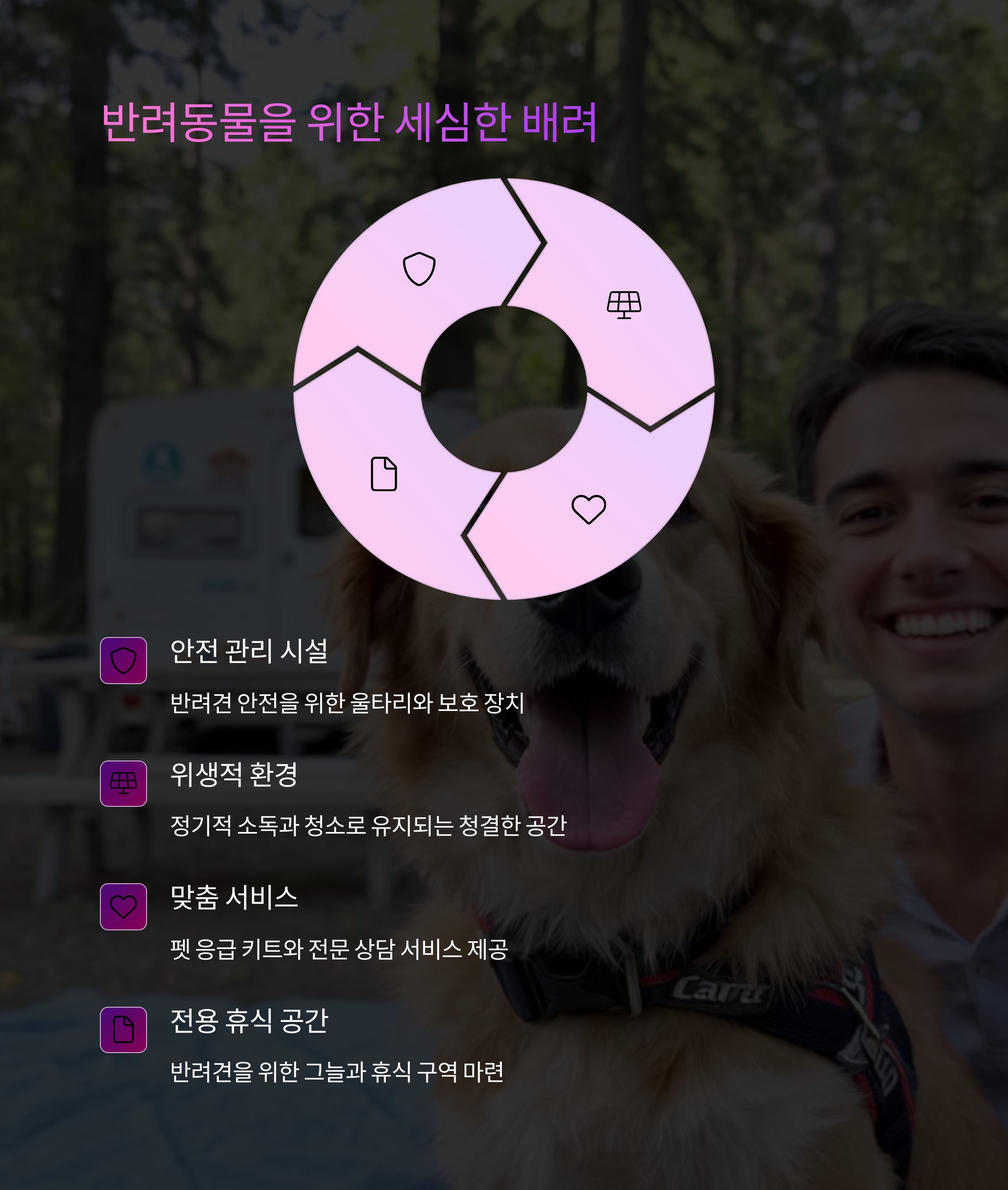 | 반려견이 마음껏 뛰어놀 수 있는 안전한 공간 | 자연과 교감하며 배우는 환경 학습 | 짜릿한 액티비티 체험 가능 |