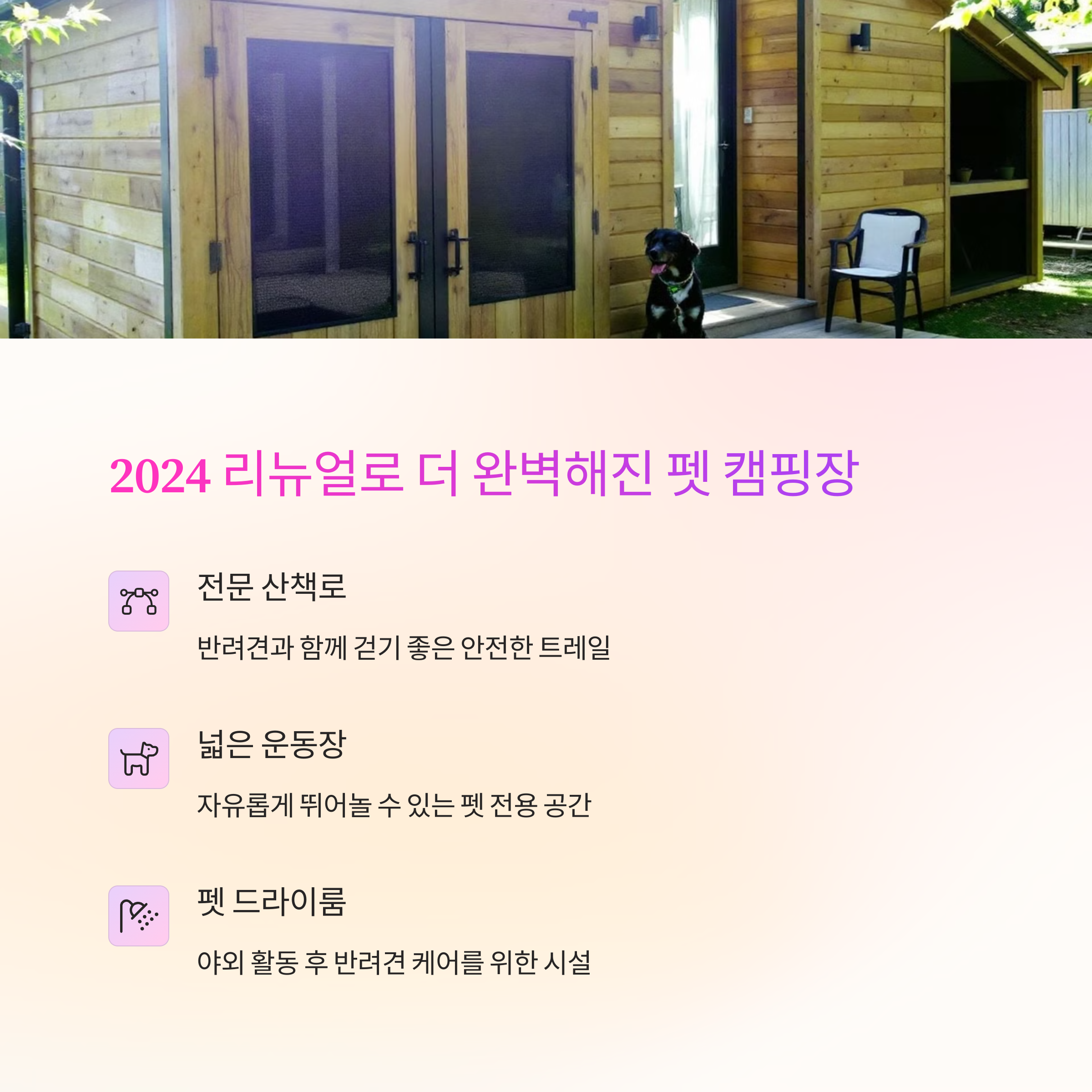 | 펫 드라이룸 연계로 깔끔하게 마무리 | 아이들과 함께하기 좋은 가족 코스 | 캠핑장과 가까워 이동 편리함 |