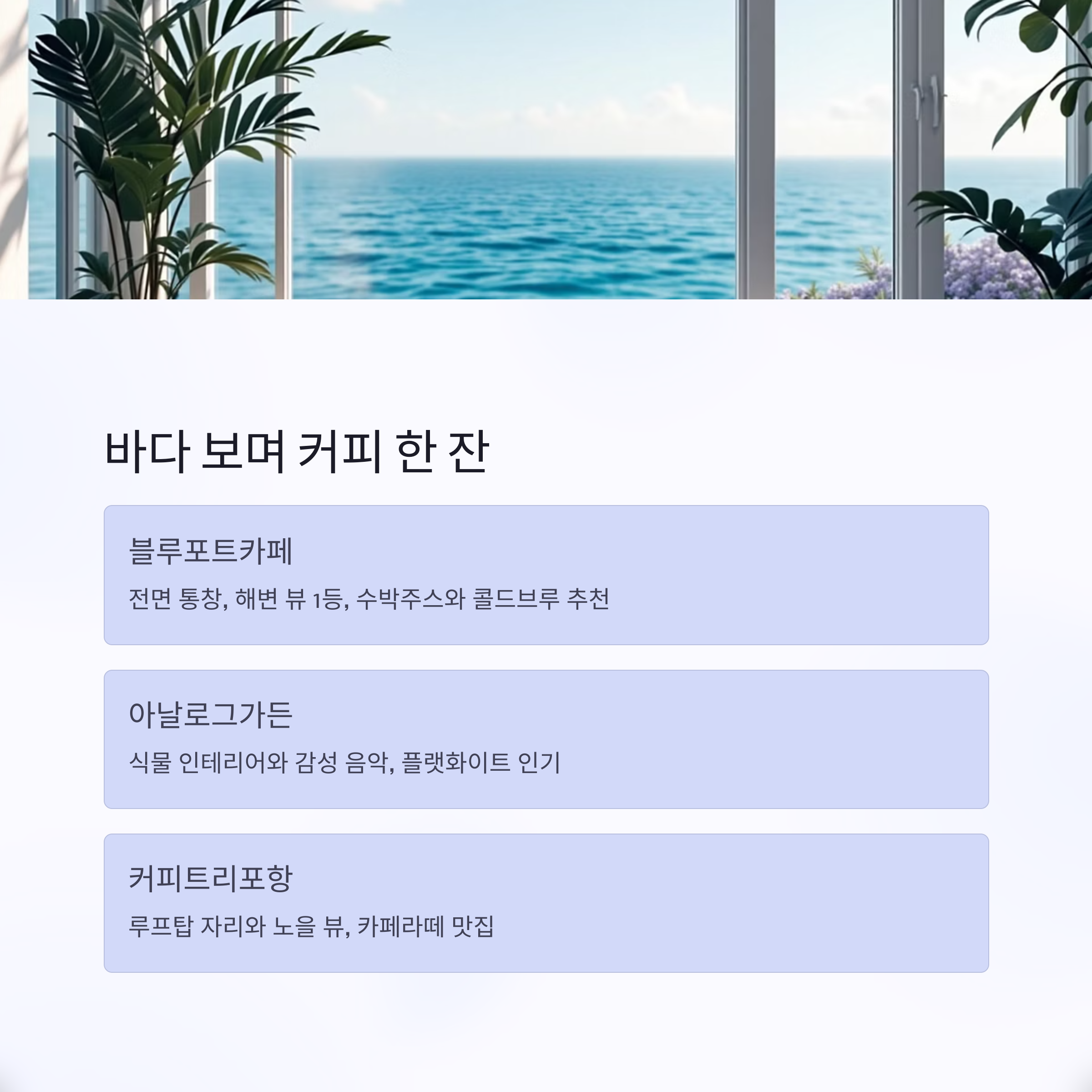 | 블루포트카페 | 전면 통창, 해변 뷰 1등 | 수박주스, 콜드브루 |