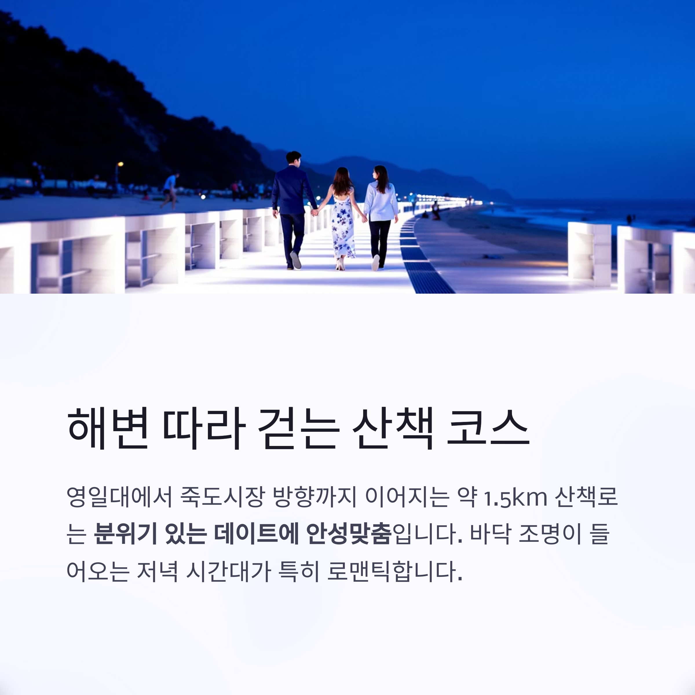 "손잡고 걷기 좋은 밤바다 산책로"로 인스타그램에서도 자주 언급되는 포인트입니다.