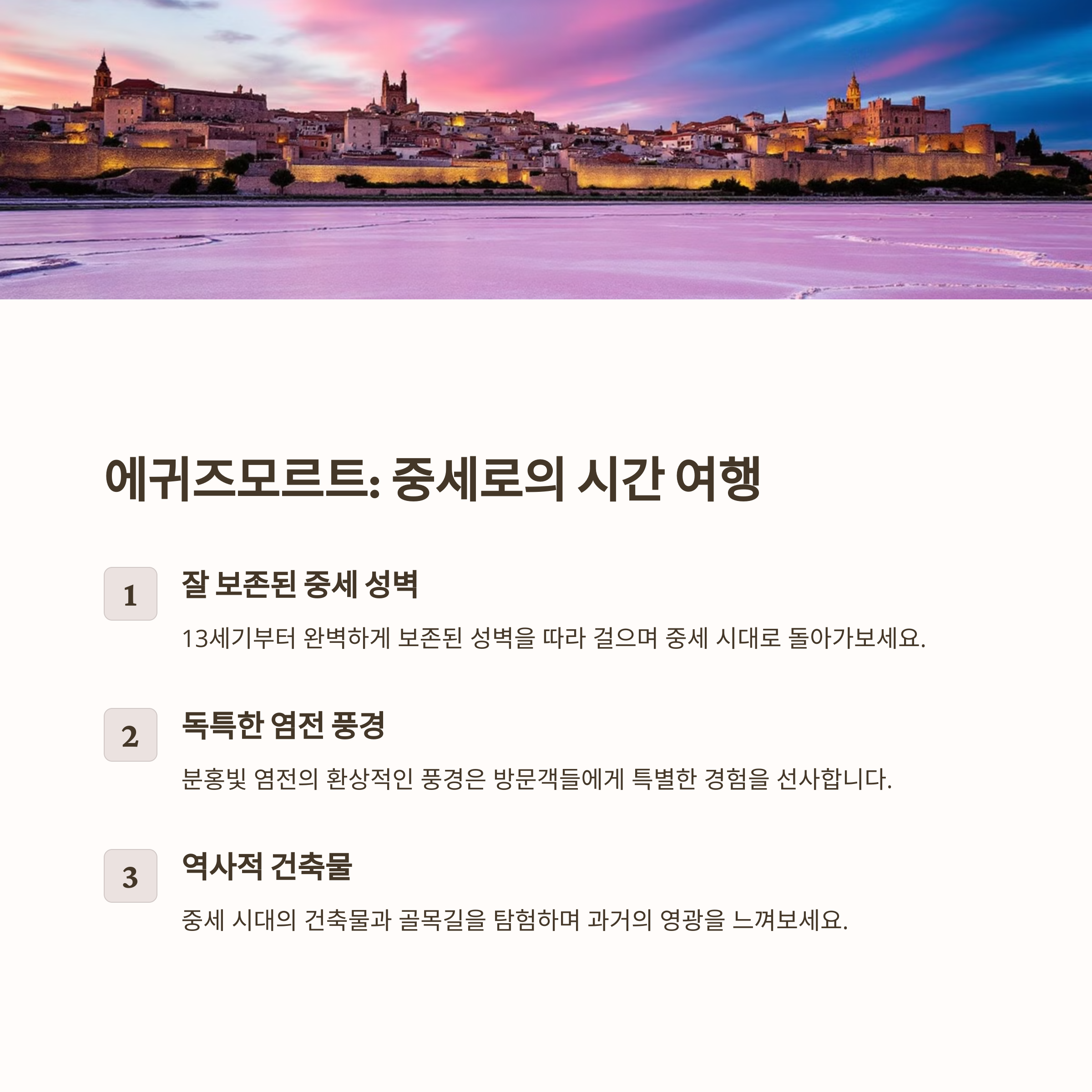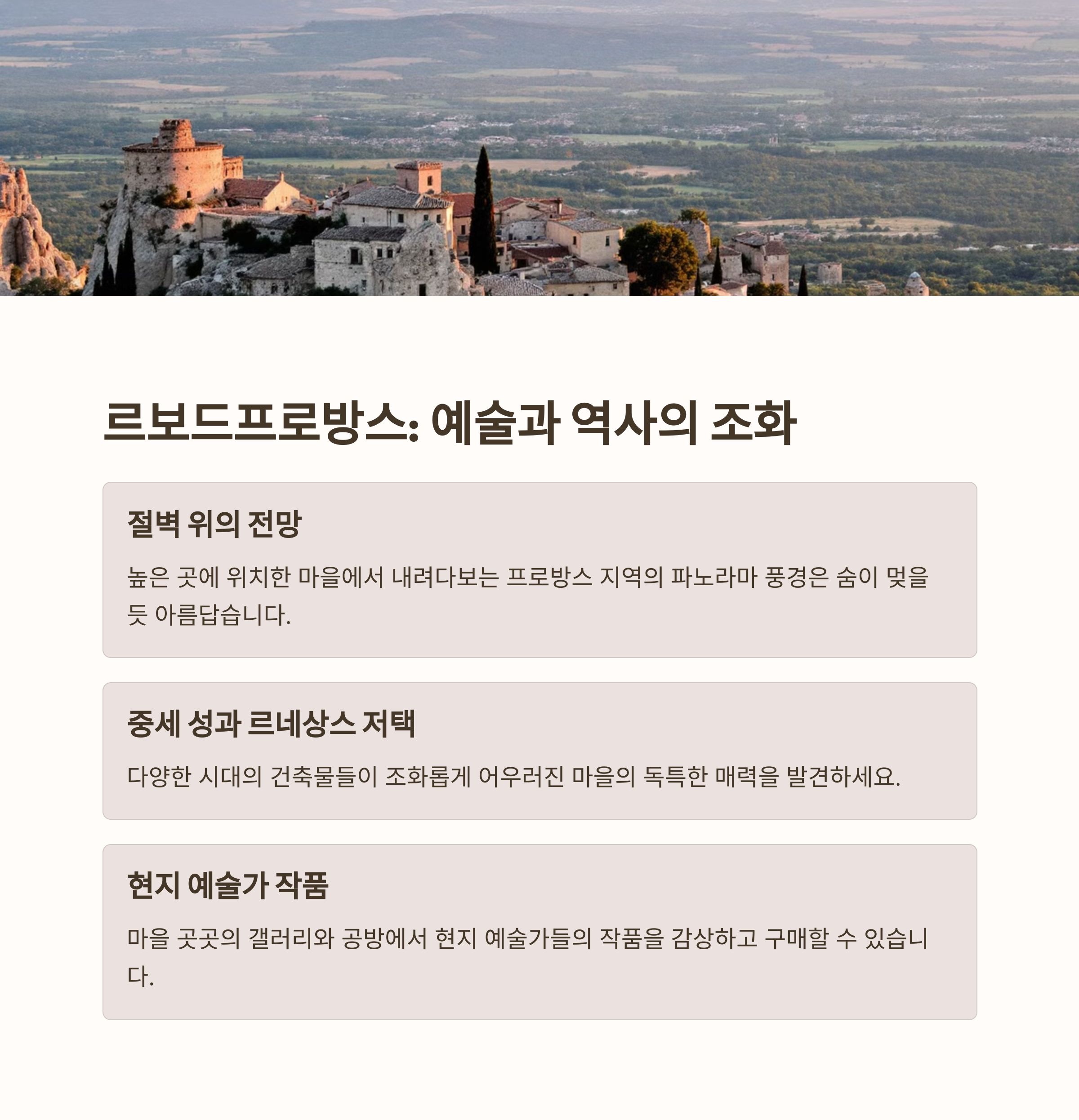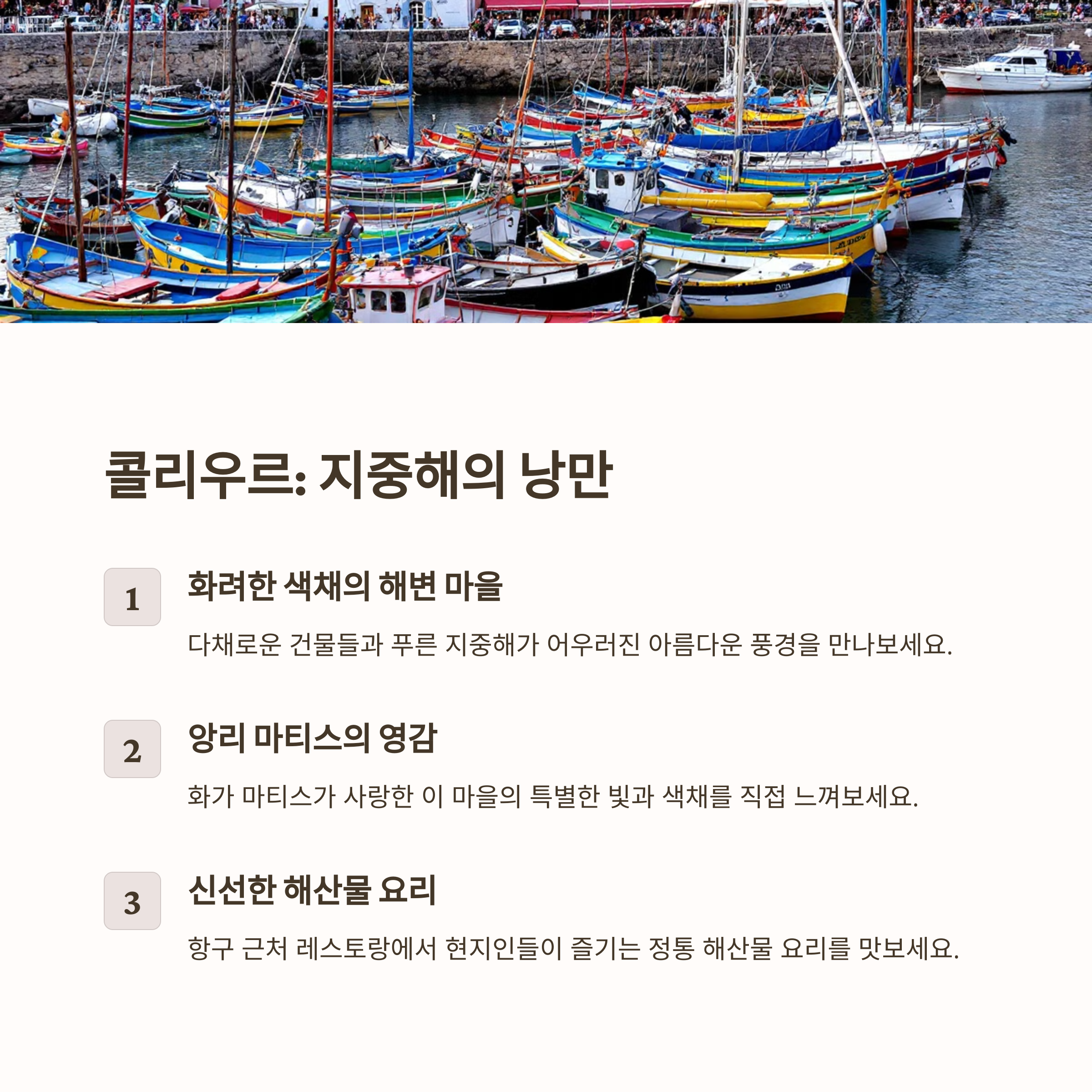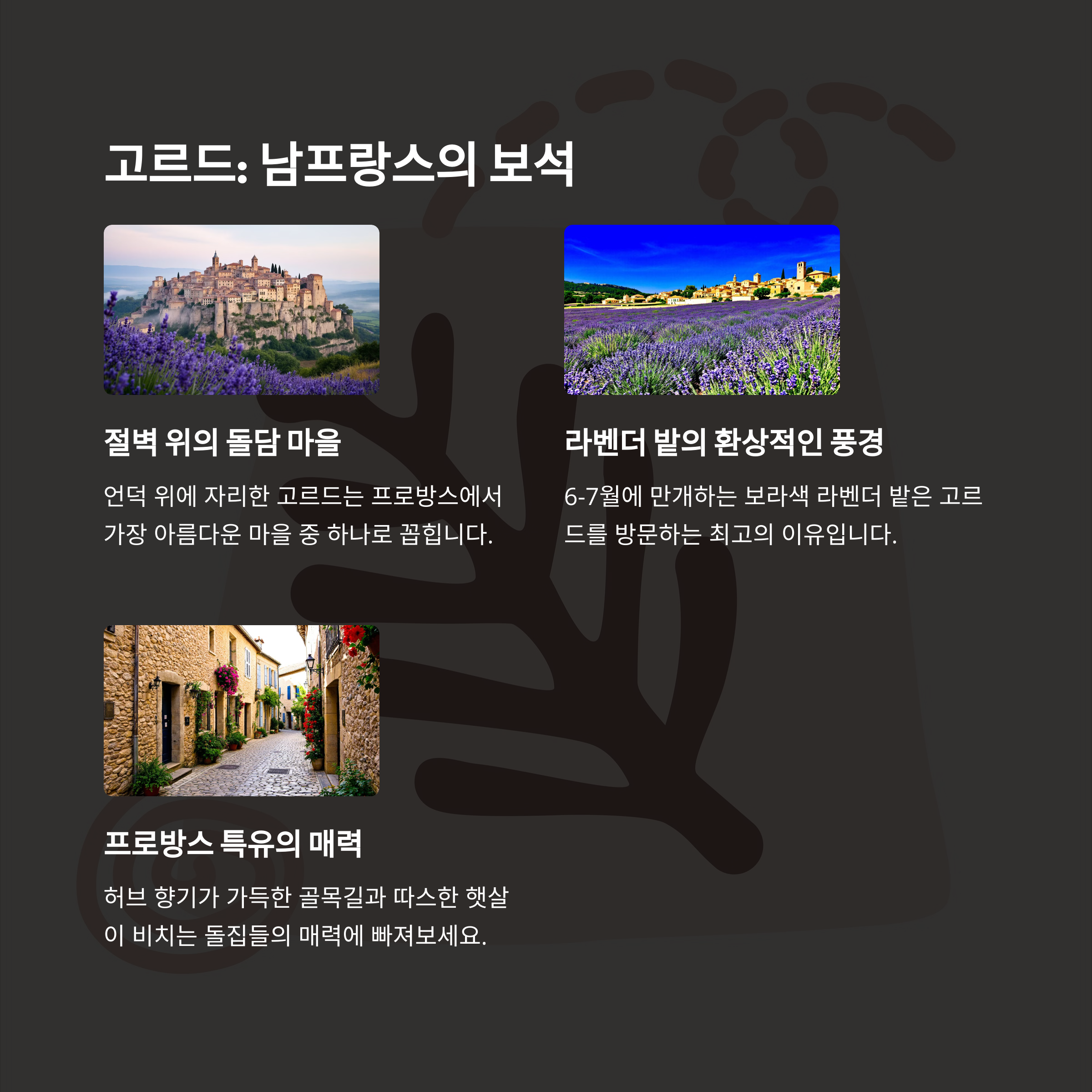 🌿 콜리우르 – 지중해의 낭만이 가득한 해변 마을 🏡 에귀즈모르트 – 중세 시대 성벽 안에서 만나는 고풍스러운 거리 🍇 생테밀리옹 – 와이너리 투어와 함께하는 여유로운 하루 🎨 르보드프로방스 – 예술과 역사가 어우러진 돌담 마을 🌻 고르드 – 라벤더 향이 가득한 프랑스 남부의 보석