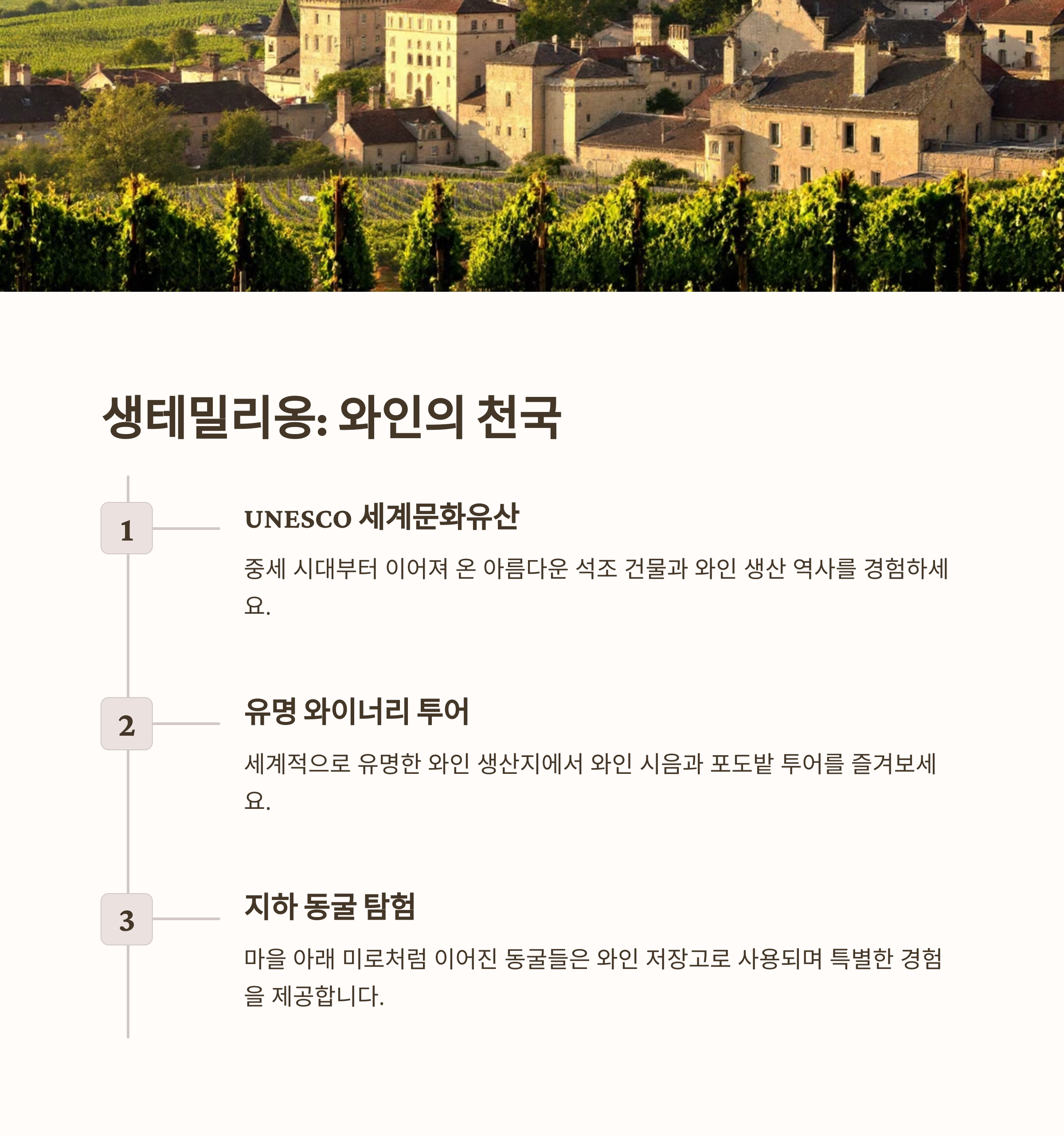 | 감성적인 골목길 | 와인과 미식 여행 | 자연 속 힐링 |