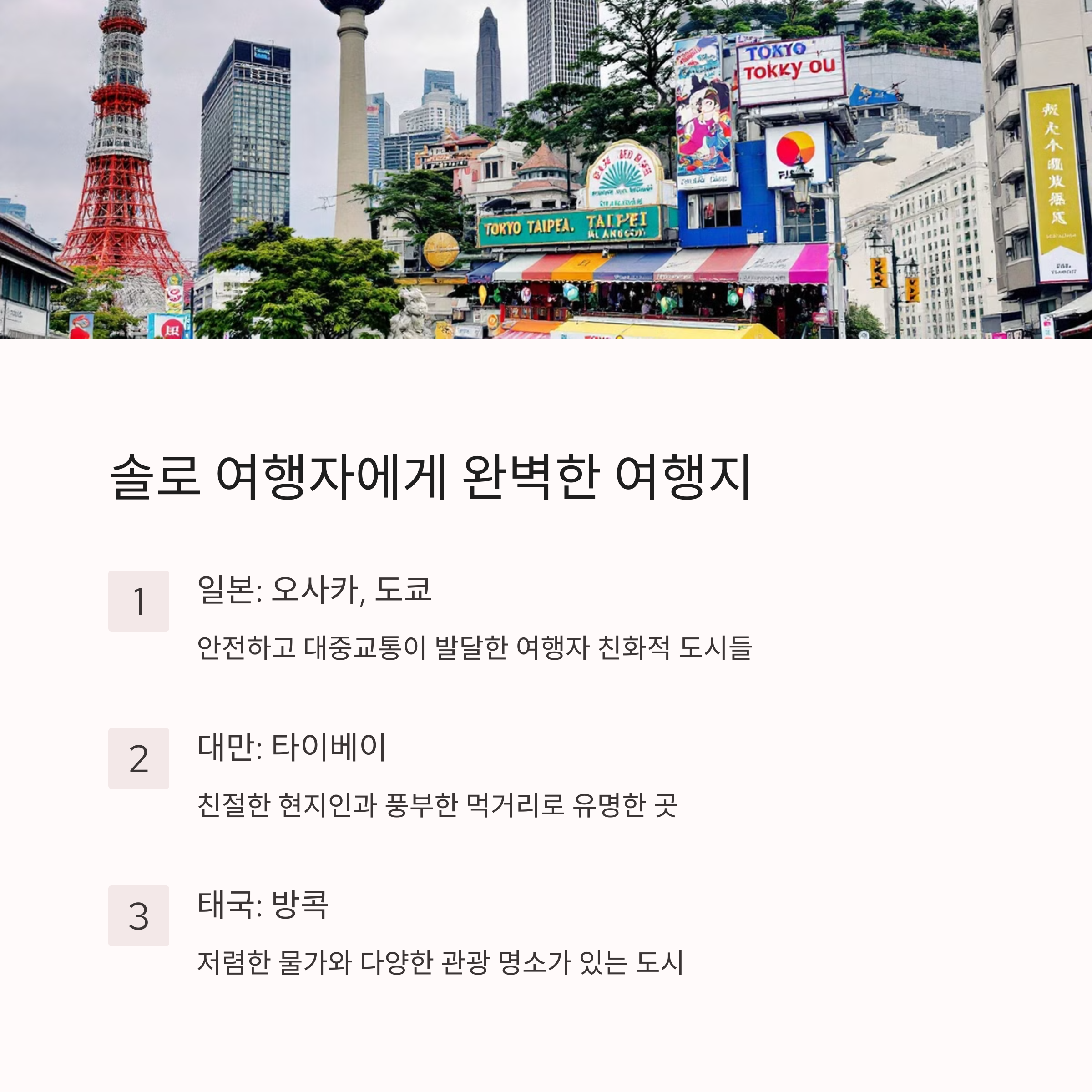 일본(오사카, 도쿄), 대만(타이베이), 태국(방콕)과 같은 도시는 대중교통이 편리하고 혼자 여행하는 사람들이 많아 초보 여행자들에게 추천됩니다.