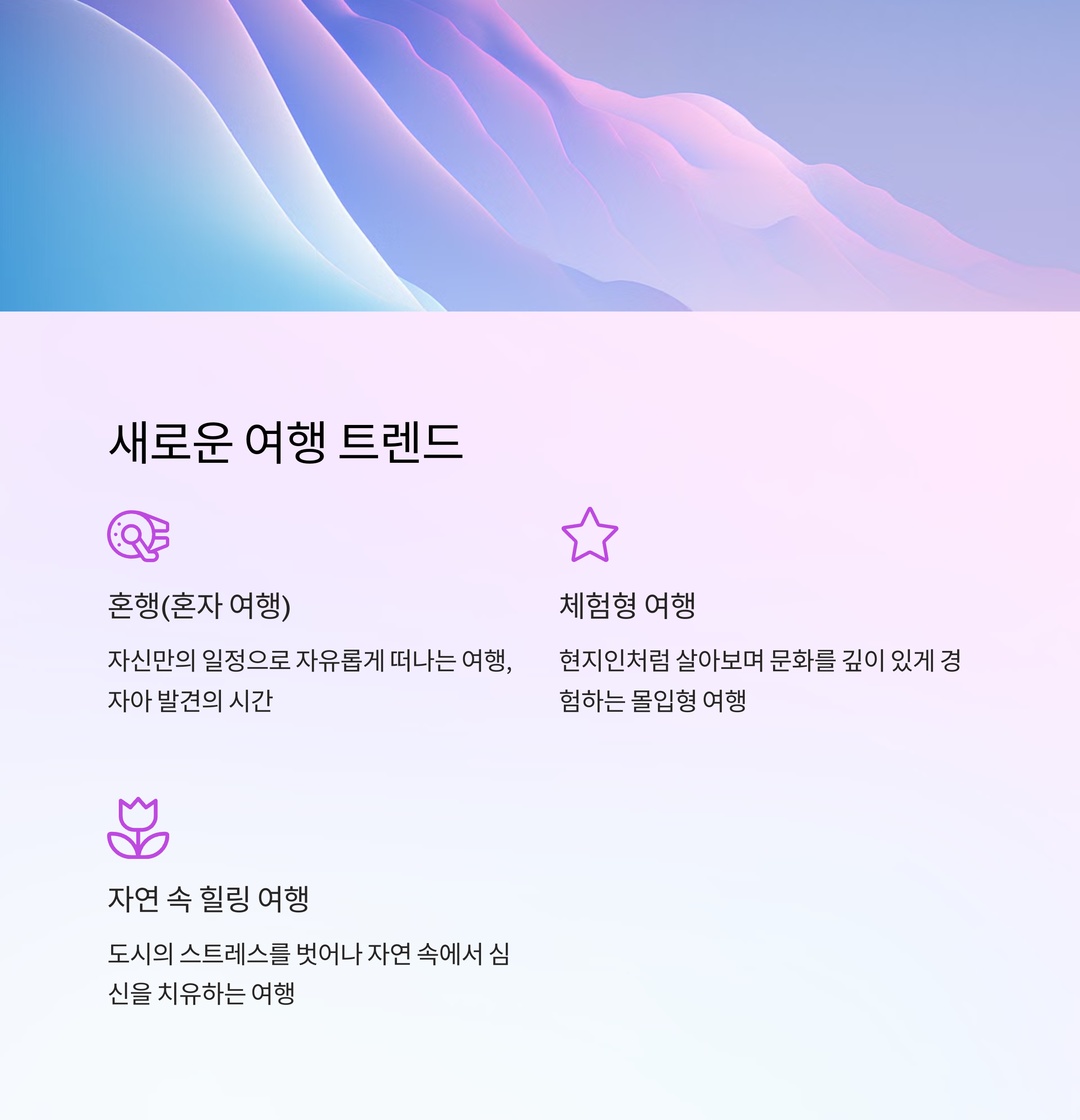힐링 여행, 감성 여행, 체험형 여행이 점점 인기를 얻고 있습니다. 특히 혼자 여행을 즐기는 트렌드도 계속 확산되고 있습니다.