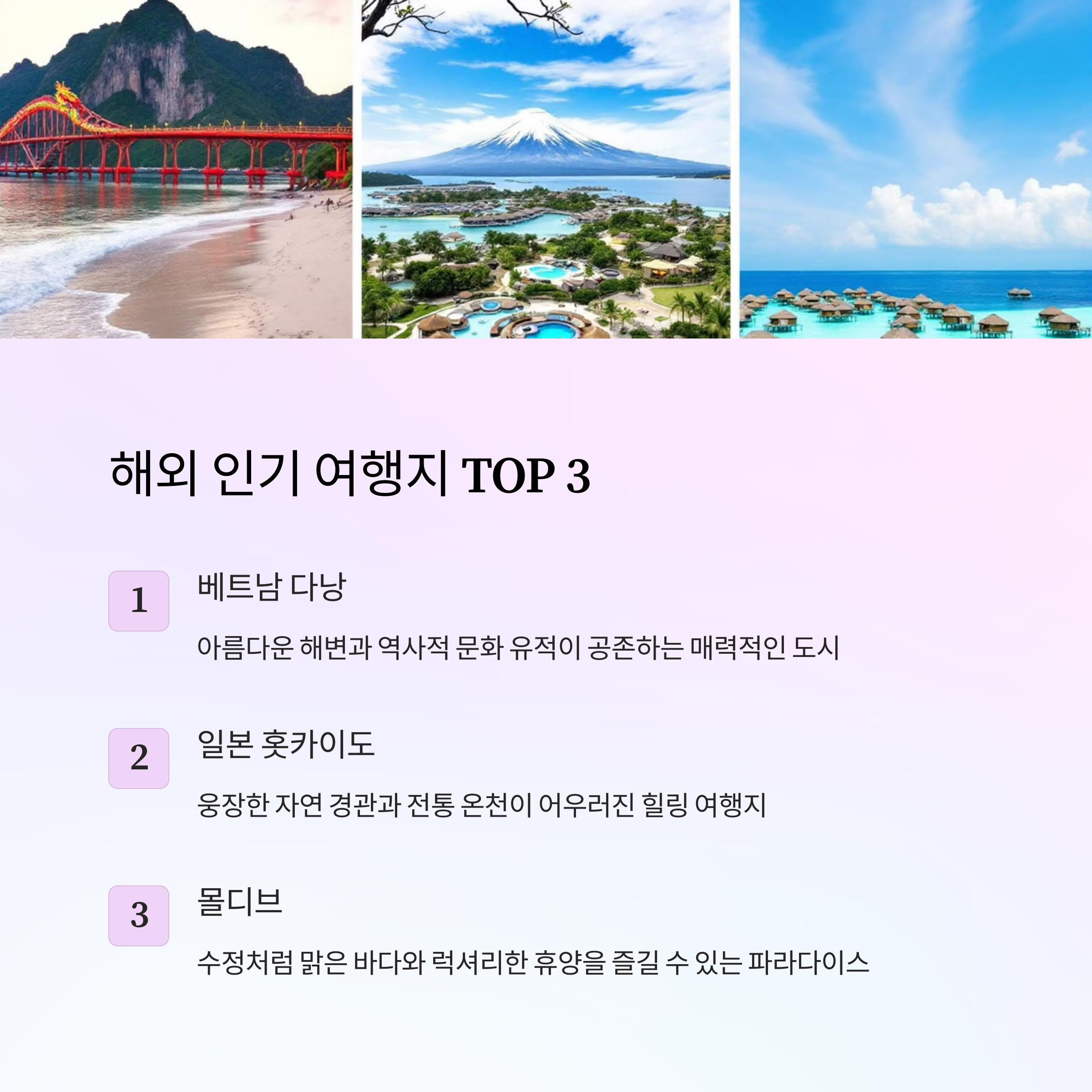 2025년 인기 여행지로는 베트남 다낭, 일본 홋카이도, 몰디브가 주목받고 있습니다. 국내에서는 강릉 안목해변, 제주 애월, 부산 감천문화마을이 감성적인 여행지로 떠오르고 있습니다.
