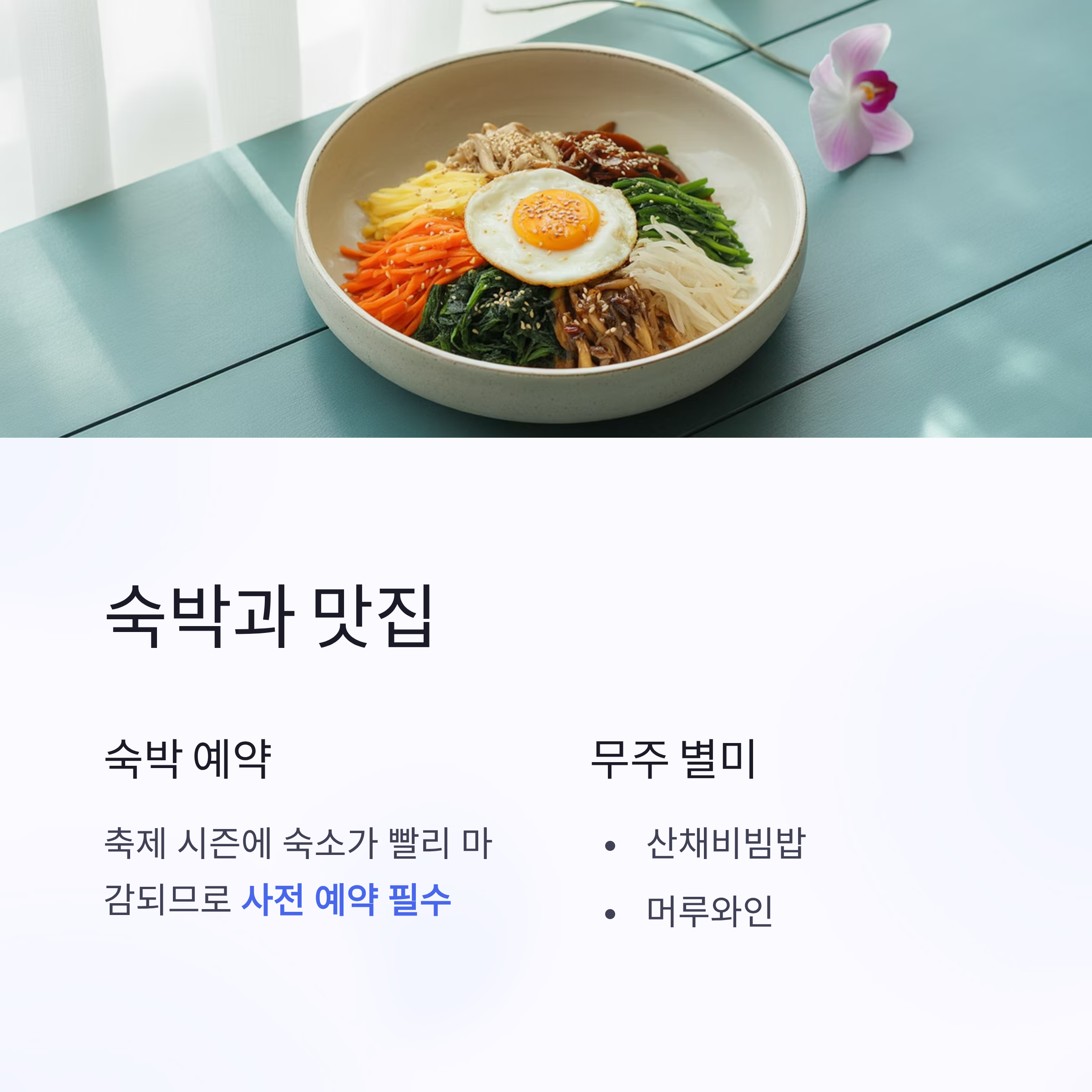 무주는 축제 시즌에 숙소가 빨리 마감되므로 사전 예약이 필수입니다. 무주 특산물인 산채비빔밥, 머루와인은 꼭 맛봐야 할 별미로, 지역의 풍미를 더해줍니다.