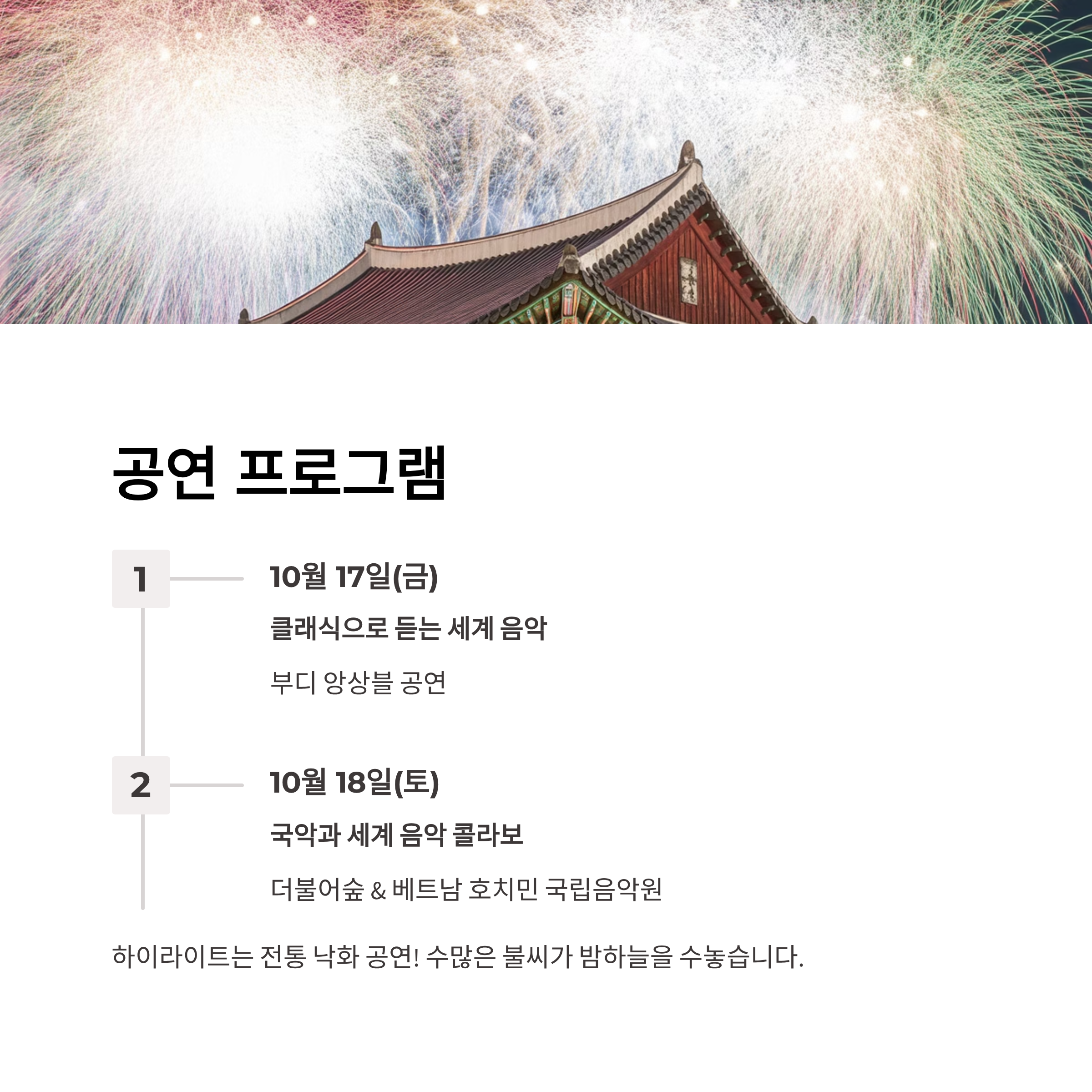 | 10월 18일(토) | 국악과 세계 음악 콜라보 | 더불어숲 & 베트남 호치민 국립음악원 |