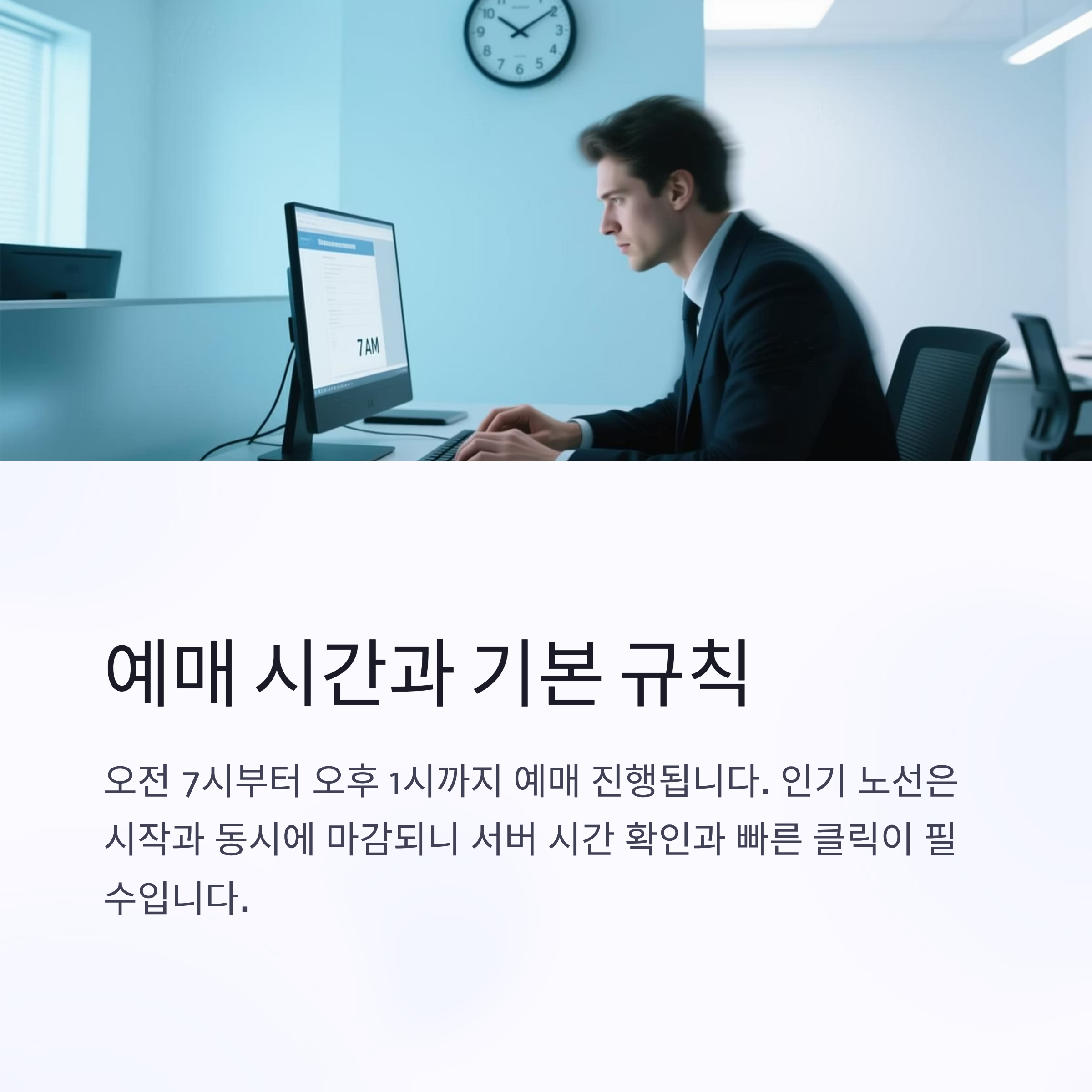 예매는 오전 7시부터 시작해 오후 1시까지 진행됩니다. 가장 인기 있는 노선과 시간대는 시작과 동시에 마감되므로, 서버 시간 확인과 빠른 클릭이 필수입니다.