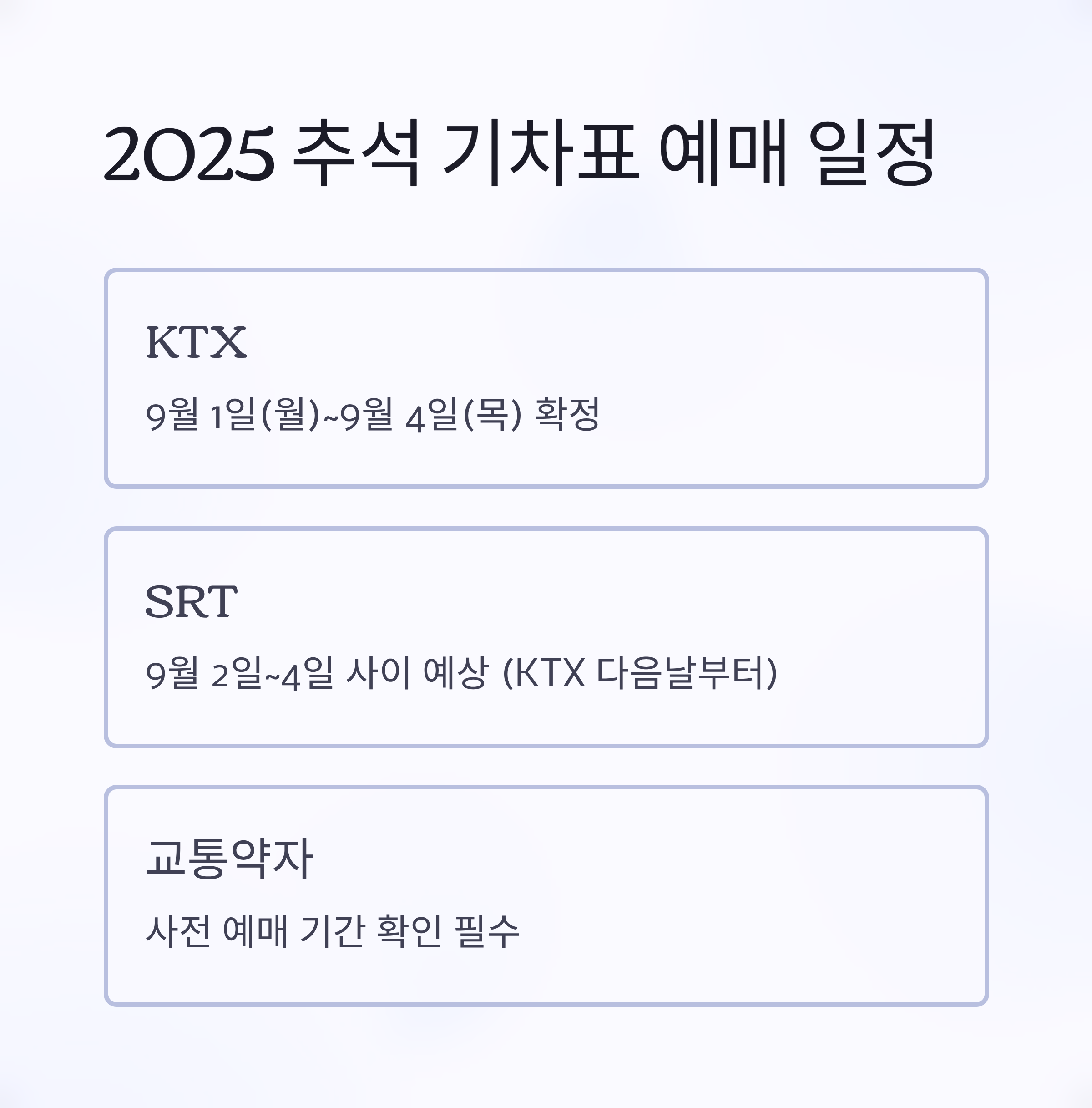 2025 추석 KTX 예매는 9월 1일(월)9월 4일(목)로 확정되었습니다. SRT는 보통 KTX 다음날부터 진행되므로 9월 2일4일 사이가 유력합니다. 교통약자 사전 예매가 먼저 시작되니 대상자는 반드시 확인해야 합니다.