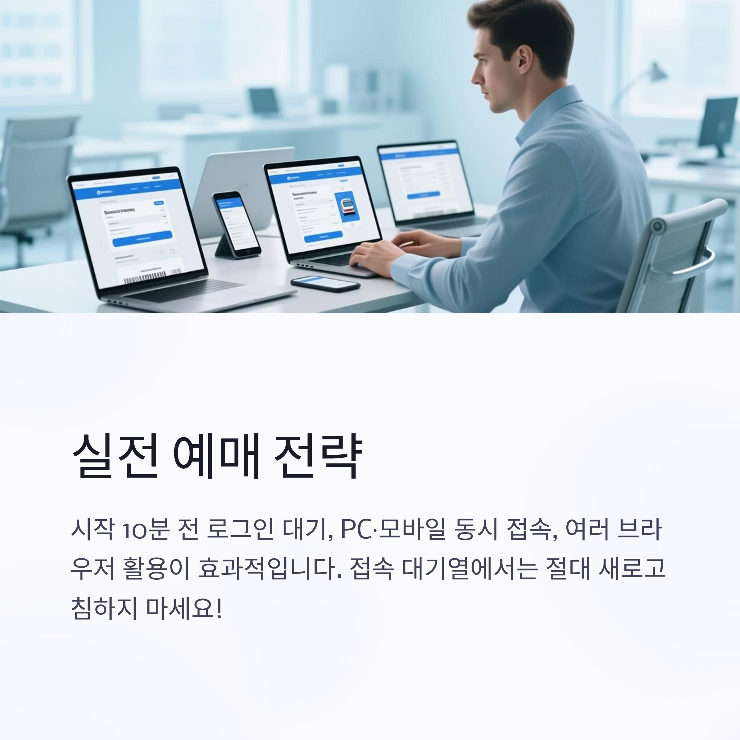 예매 당일에는 시작 10분 전부터 로그인 대기, PC·모바일 동시 접속, 크롬·엣지 등 여러 브라우저 활용이 효과적입니다. 접속 대기열 화면에서는 새로고침을 절대 하지 않는 것이 핵심입니다.