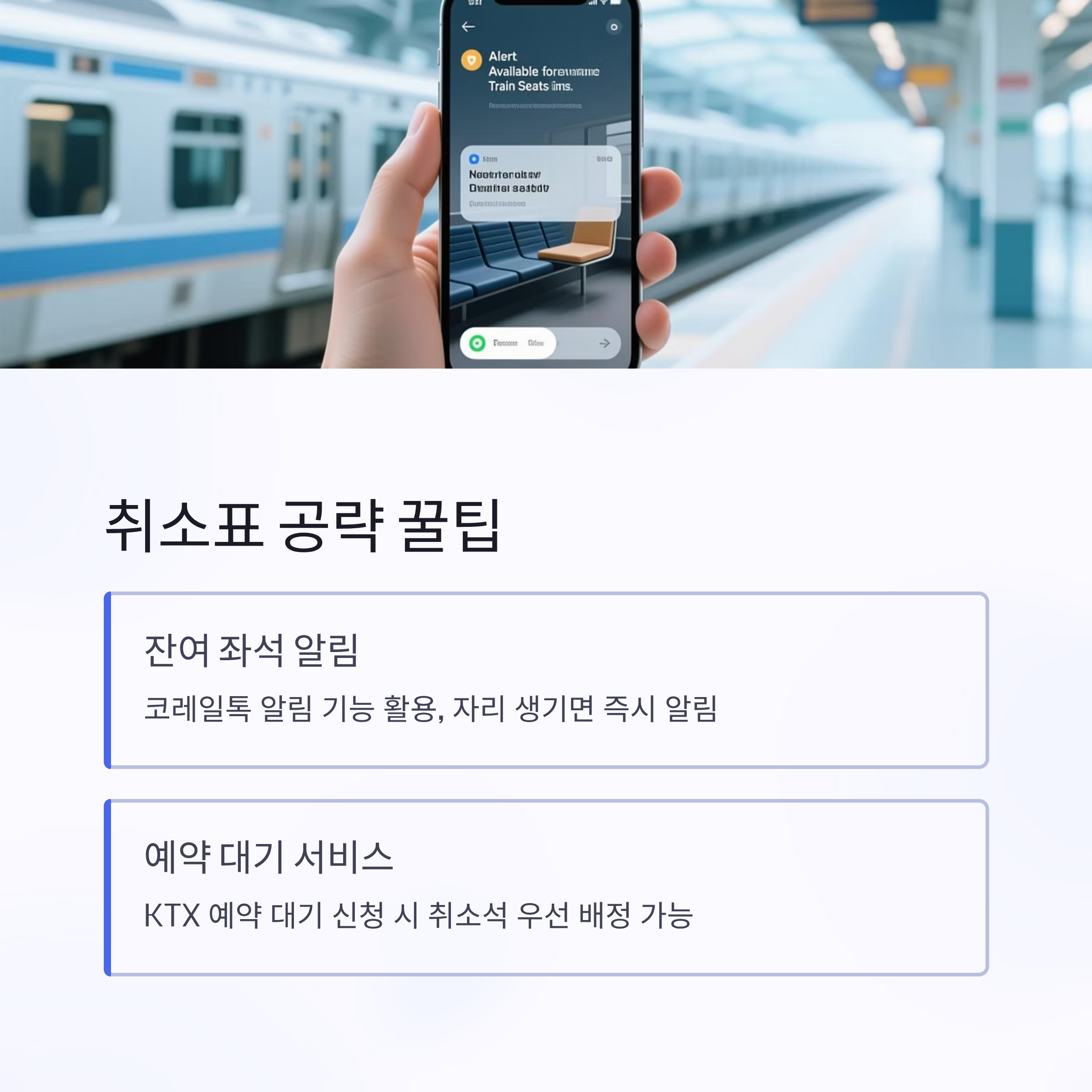 코레일톡의 잔여 좌석 알림 기능을 반드시 활용하세요. 원하는 구간에 자리가 생기면 즉시 알림을 받을 수 있습니다. 또한 KTX 예약 대기 서비스를 신청하면 취소석이 나올 때 우선 배정받을 수 있습니다.