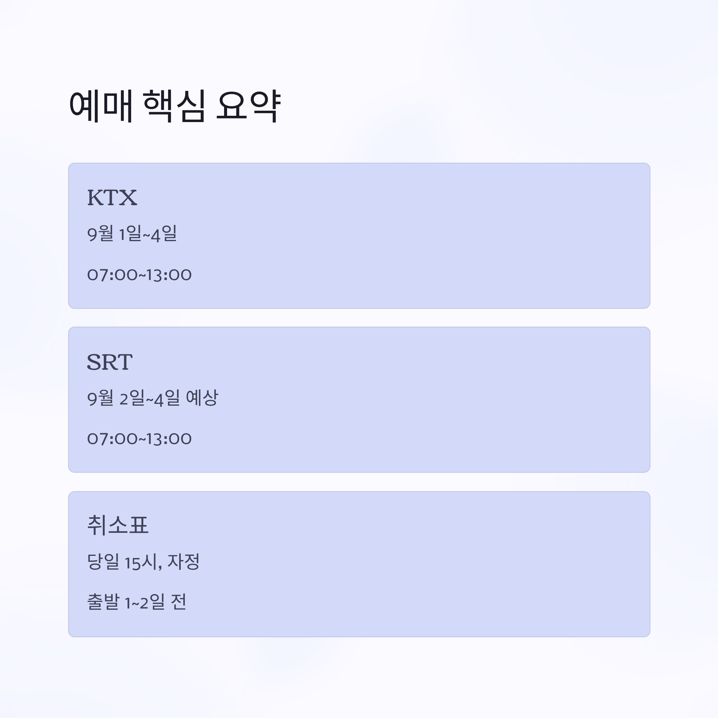 | SRT | 9월 2일~4일 예상 | 07:00~13:00 | KTX 이후 시작 |