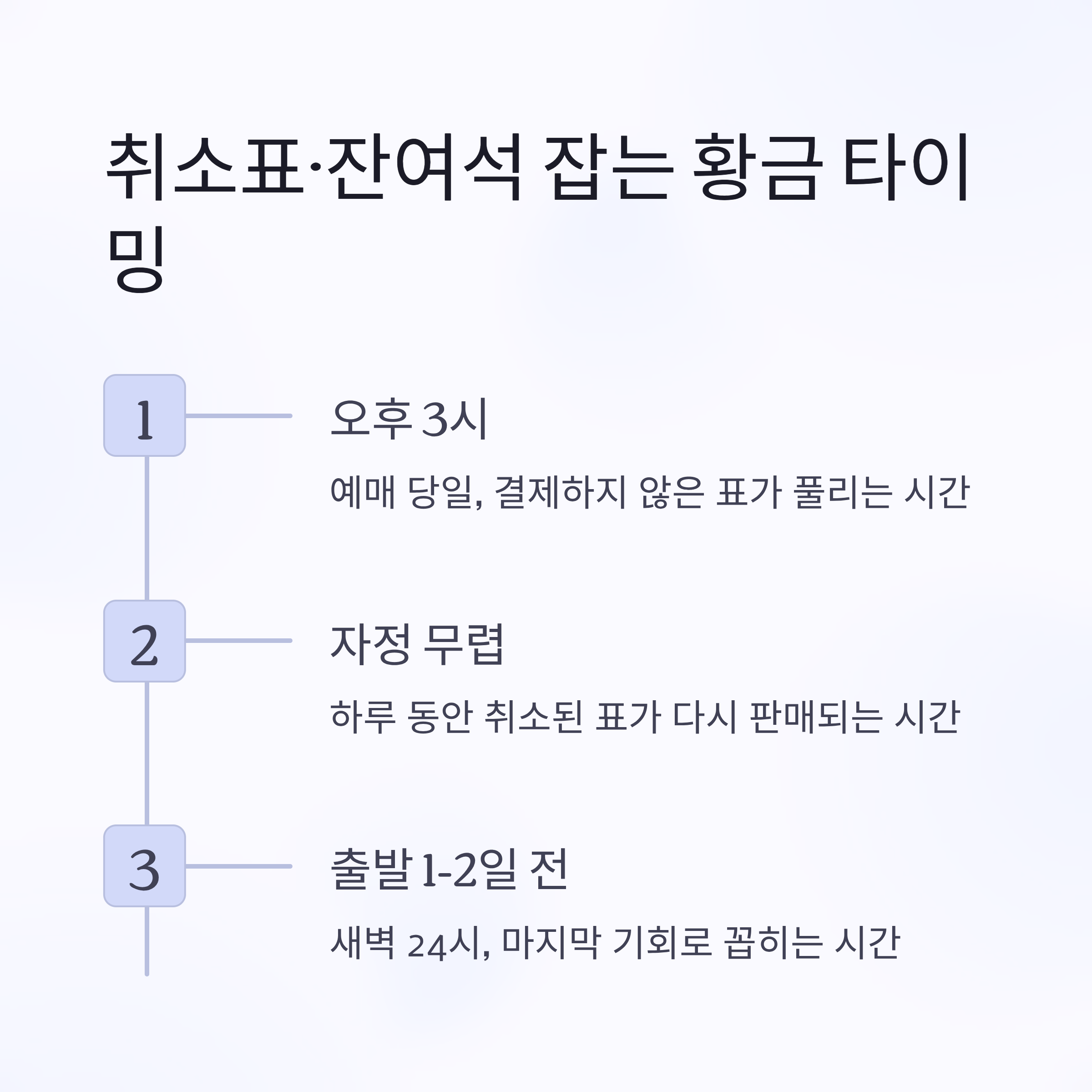 첫 번째 기회는 예매 당일 오후 3시, 결제하지 않은 표가 풀릴 때입니다. 또 자정 무렵, 하루 동안 취소된 표가 다시 판매되며, 출발 12일 전 새벽 24시도 마지막 기회로 꼽힙니다.