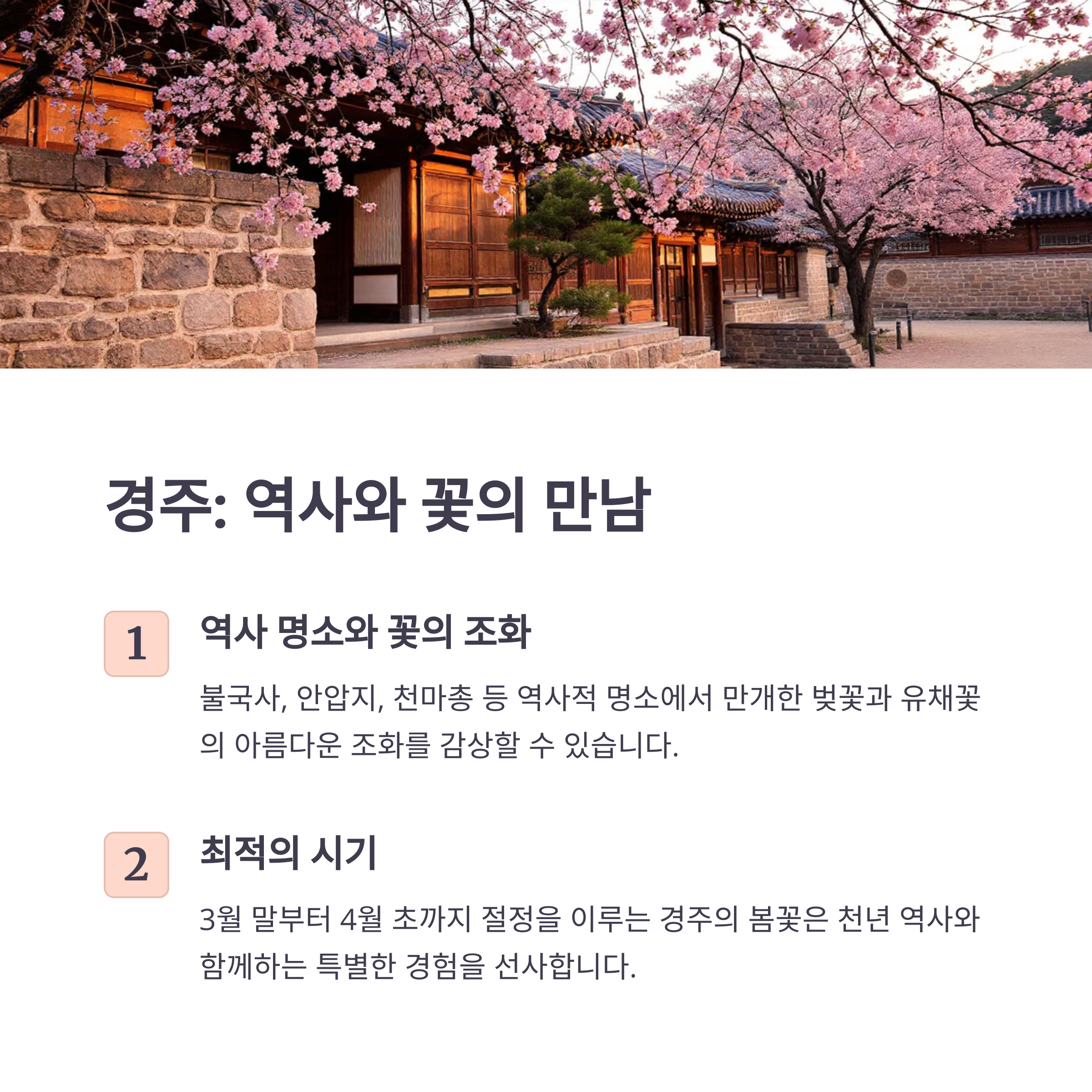 3월 중순부터 4월 초까지 국내 곳곳에서 다양한 봄꽃을 감상할 수 있습니다. 벚꽃, 매화, 유채꽃, 산수유 등 다채로운 꽃과 함께 역사 탐방, 자연 체험, 도심 관광을 함께 즐겨보세요.