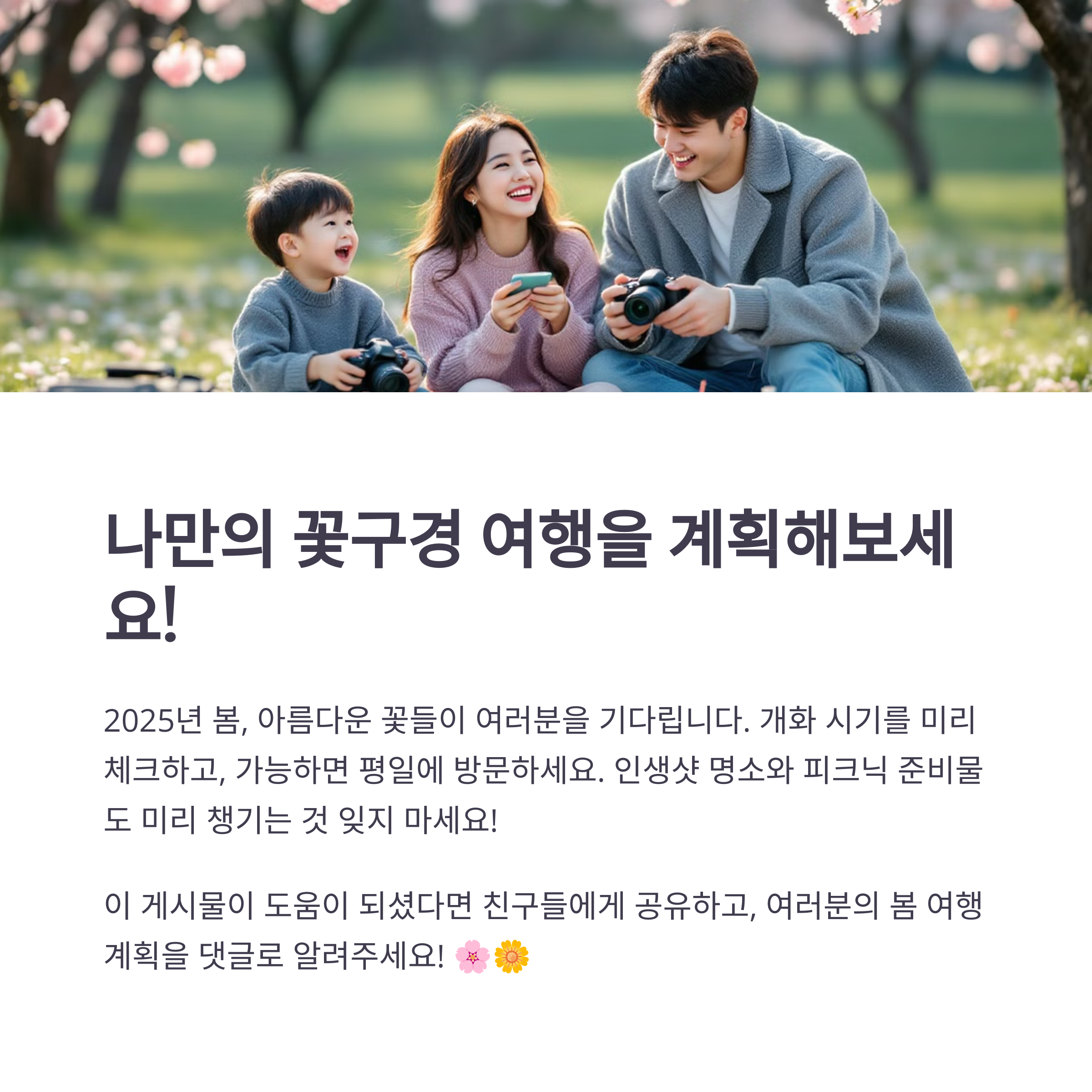 여러분이 다녀온 국내 봄꽃 여행지 중에서 추천하고 싶은 장소가 있다면 댓글로 공유해주세요! 특별한 봄꽃 여행을 함께 나누어요.