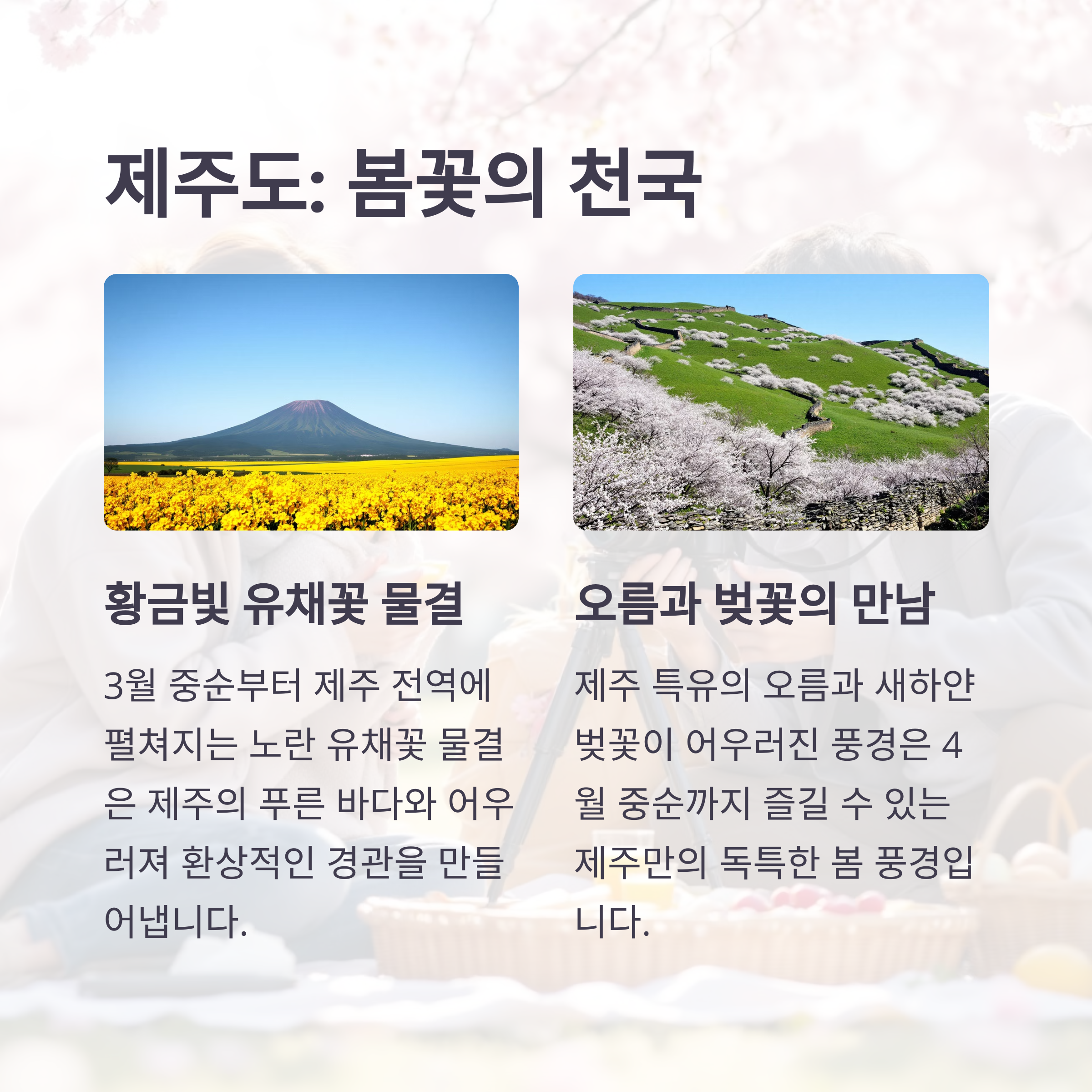 | 봄꽃 종류 | 벚꽃, 유채꽃, 매화, 산수유 등 다양한 꽃 감상 가능 |