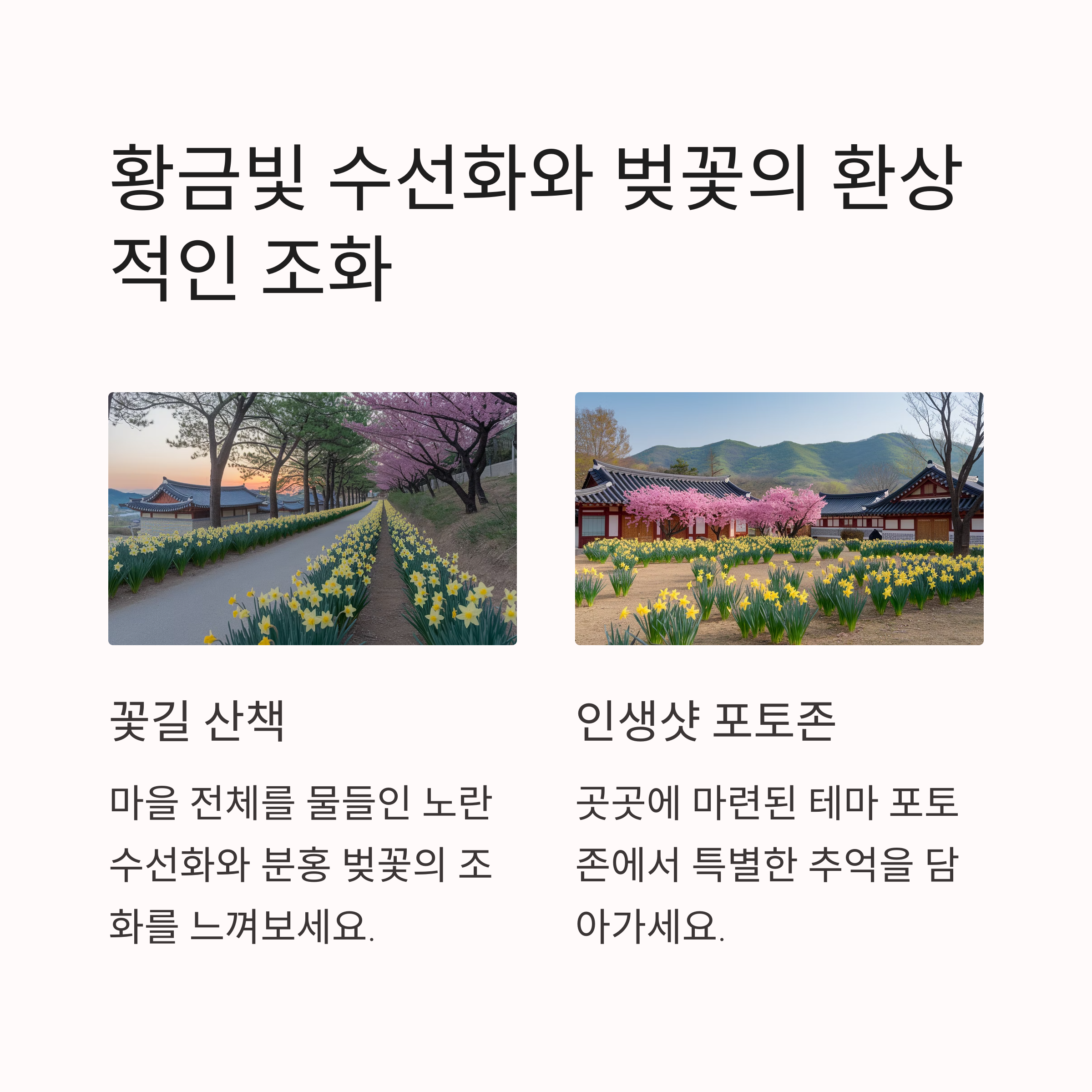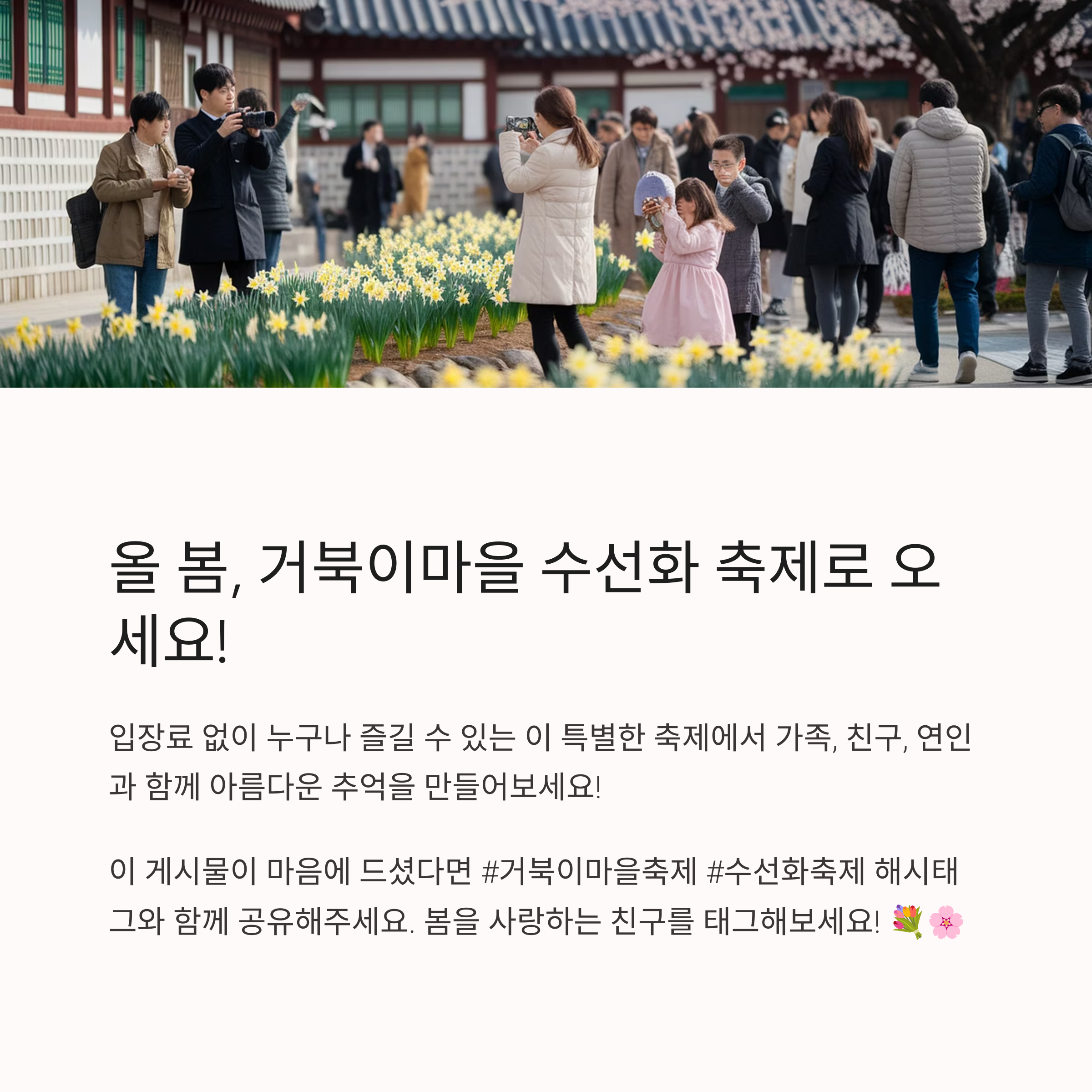 거북이마을 수선화 축제는 대형 행사보다 더 아기자기하고 따뜻한 분위기의 마을 축제로 유명합니다. 마을 골목골목마다 노란 수선화와 흐드러진 벚꽃이 펼쳐져 어디서든 감성 사진을 찍을 수 있고, 마을 주민들이 직접 기획한 거북이 마당놀이와 부보상 마당극은 웃음과 감동을 동시에 선사합니다. 인위적인 무대가 아닌 자연 그대로의 풍경 속 공연이 이 축제의 가장 큰 매력입니다.