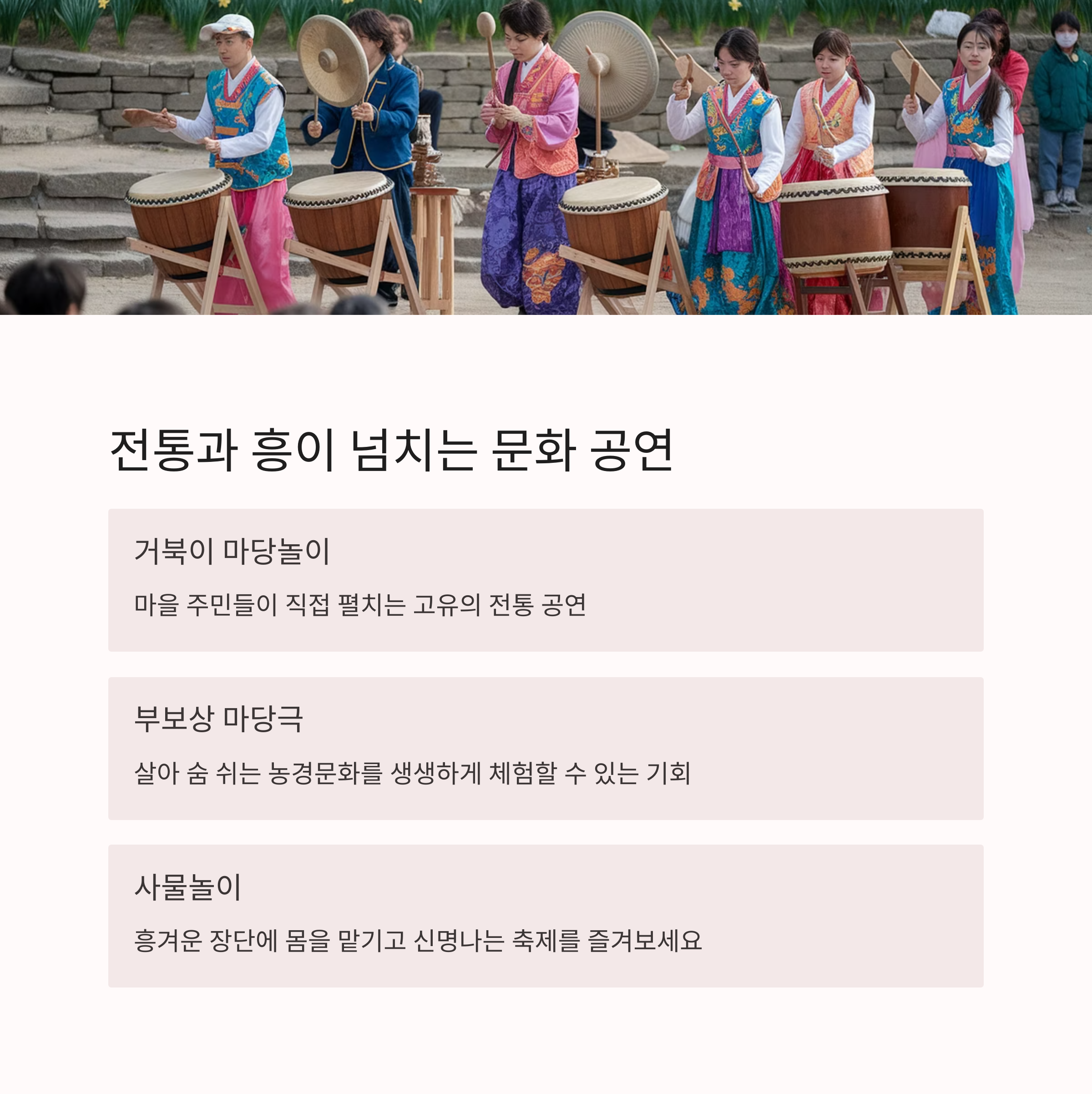 축제 기간 동안 마을 곳곳에서는 다양한 체험 프로그램이 운영됐습니다. 수선화 심기 체험, 꽃길 걷기, 탈쓰기, 민속놀이 등 어린이부터 어르신까지 누구나 참여할 수 있어 가족 단위 방문객들에게 특히 인기가 많았습니다. 체험은 대부분 무료 또는 현장 선착순 접수로 운영돼 자유로운 분위기 속에서 마을 사람들과 자연스럽게 어울릴 수 있는 ‘진짜 마을 축제’의 감동을 느낄 수 있었어요.