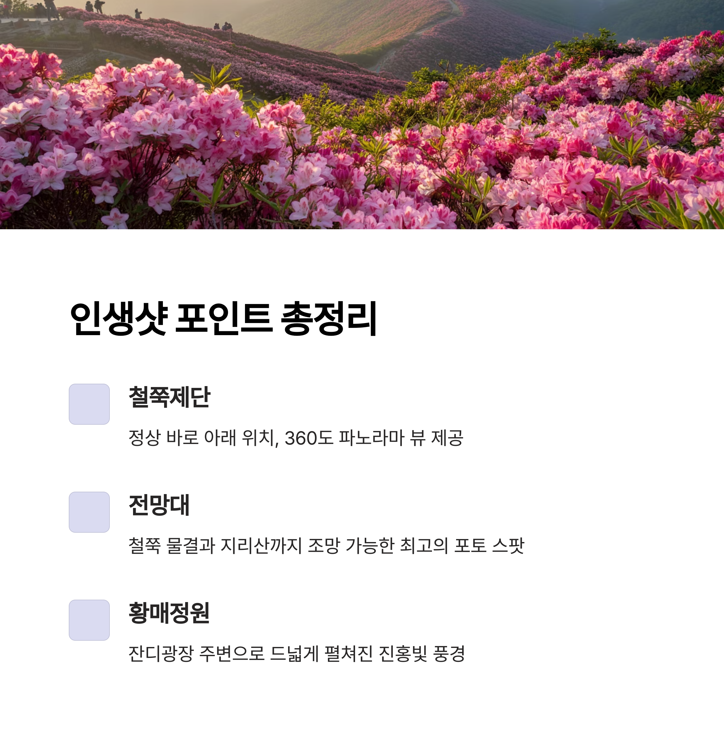 "특히 해 질 녘 철쭉 능선은 정말 영화 같은 풍경을 만들어줘요"