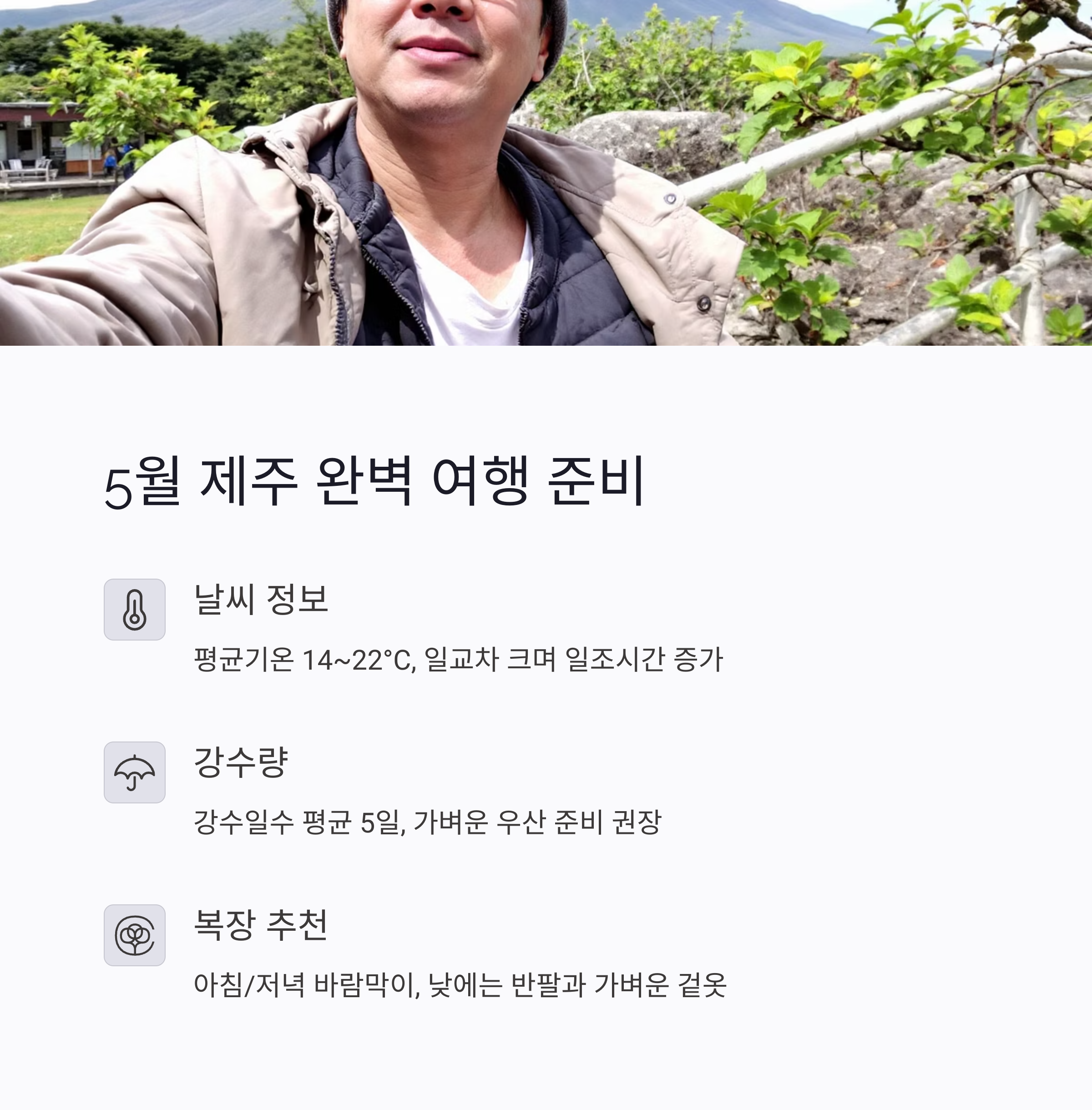 5월 제주도는 초여름처럼 따뜻하지만 바람은 여전히 강할 수 있어요